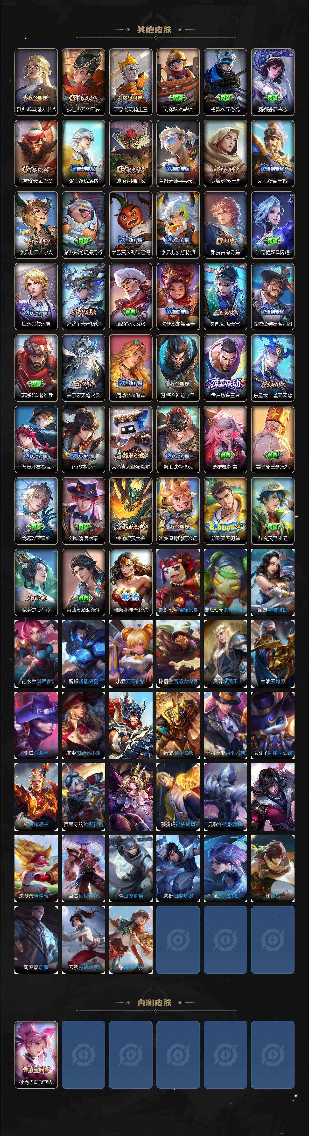 【限定皮肤】:姜子牙天穹之誓,杨戬破阵退雄兵,狄仁杰阴阳师,赵云皇家上将,孙尚香蔷薇恋人,鲁班七号狮舞东方,阿轲迷踪丽影,元歌云间偶戏,典韦穷奇,典韦蓝屏警告,马可波罗暗影游猎,狄仁杰魔术师,狄仁杰万华元夜,达摩沙漠行僧,项羽海滩派对,老夫子醍醐杖,程咬金演武夺筹,刘邦夺宝奇兵,亚瑟潮玩骑士王,孙悟空至尊宝,孙悟空大圣娶亲,孙悟空零号赤焰,牛魔御旌,李元芳云中旅人,虞姬霸王别姬,钟馗神迹守卫,钟馗驱傩正仪,女娲朔望之晖,雅典娜单词大作战,鬼谷子原初探秘者,鬼谷子五谷丰年,百里玄策白虎志,沈梦溪星空之诺,明世隐疑决卦,裴擒虎天狼狩猎者,裴擒虎李小龙,狂铁御狮,米莱狄御霄,云中君纤云弄巧,盾山御銮,猪八戒西部大镖客,上官婉儿梁祝,蒙犽狂想玩偶喵,阿古朵江河有灵,张良古海寻踪,蒙犽百解令,鬼谷子天穹祈灯,孙尚香乘龙问璇玑,沈梦溪龙舞盛年,刘邦剑破天穹,程咬金群星魔术团,周瑜熔金海岸