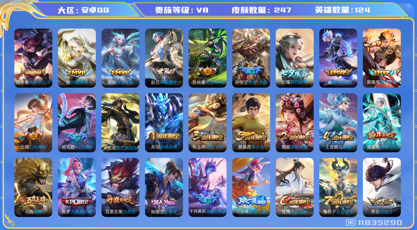 [11835290]【商品标题】:安卓Q-V8-尊贵铂金I段位-124英雄-247皮肤-1典藏-0珍品无双-0无双-0珍品传说-19传说-70史诗