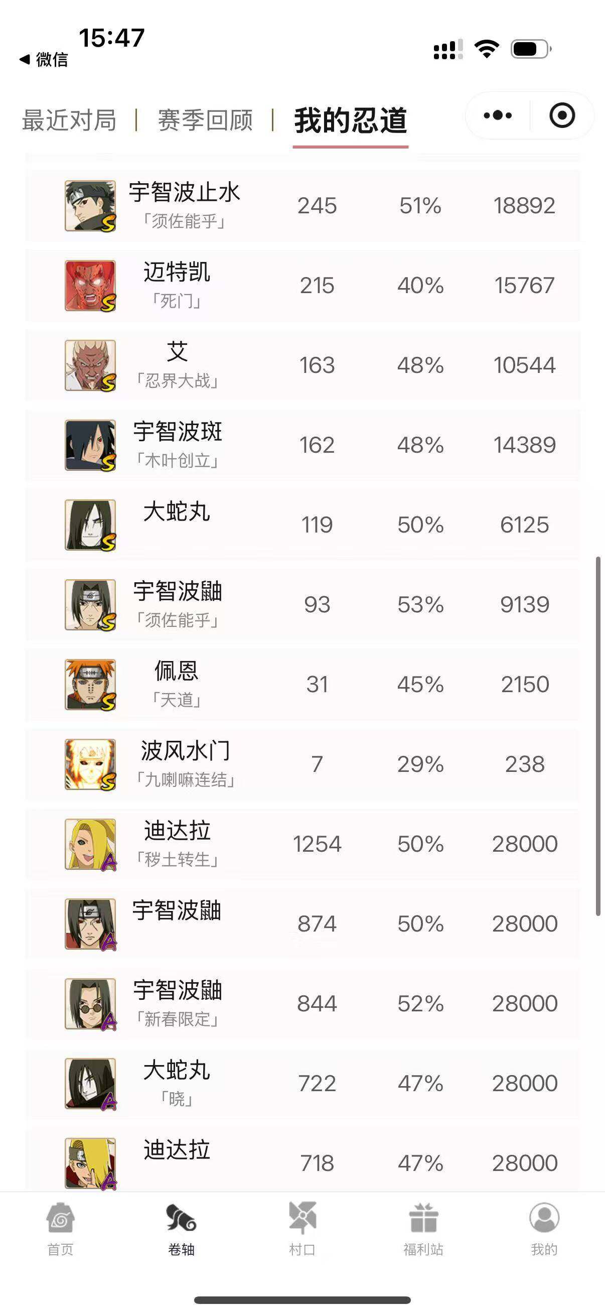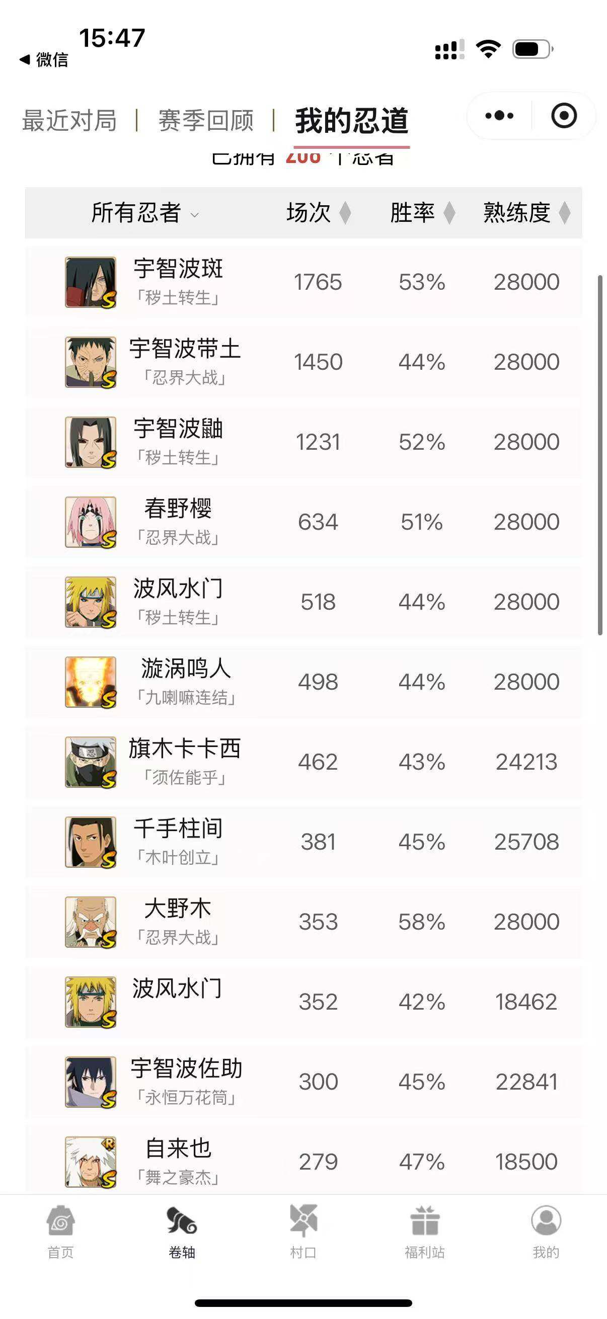 【A级忍者】:艾「青年」(2星),长门「青年」(2星),迪达拉(2星),迪达拉「新春限定」(2星),迪达拉「秽土转生」(2星),大蛇丸「晓」(2星),奇拉比「忍界大战」(2星),飞段(3星),飞段「死司凭血」(2星),干柿鬼鲛(5星),漩涡博人「桃式显现」(2星),漩涡鸣人「九尾查克拉」(2星),迈特凯(5星),旗木卡卡西「幻之真容」(2星),桃地再不斩「秽土转生」(2星),我爱罗「疾风传」(4星),蝎(3星),小南「夏日泳装」(2星),猿飞阿斯玛(5星),宇智波鼬(2星),宇智波鼬「新春限定」(2星),宇智波佐助「须佐能乎」(2星),宇智波佐助「万花筒写轮眼」(2星),照美冥「夏日泳装」(2星),照美冥「五代目水影」(2星),日向宁次「忍界大战」(2星),宇智波带土「漂泊浪客」(2星),长十郎「六代目水影」(2星),李洛克「忍界大战」(2星),黑土「博人传」(2星),秋道丁次「忍界大战」(2星),千代「近松十人卫」(2星),神农「羁绊」(2星),不缘(2星),宇智波泉奈(2星)