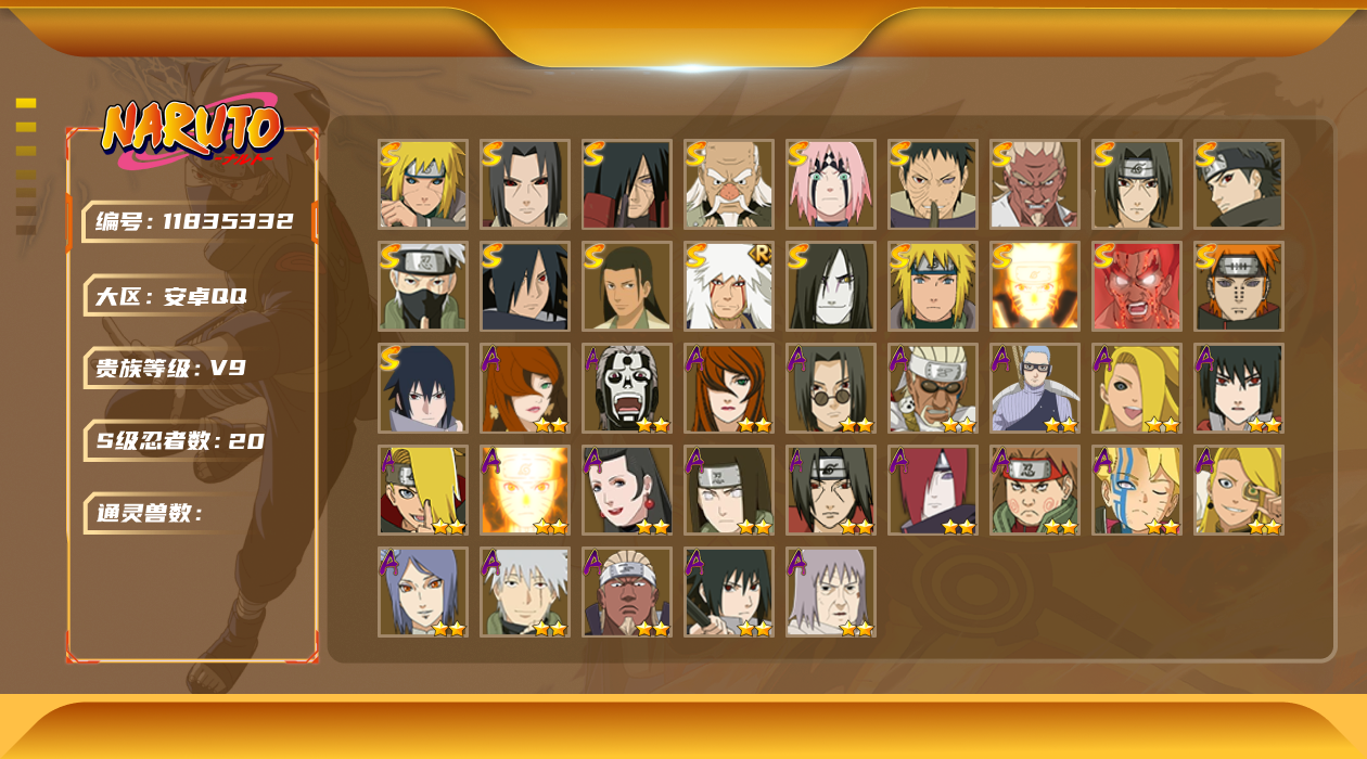 [11835332]【商品标题】:20S级忍者数-35A级忍者数 【S级忍者】:波风水门「秽土转生」(3星),宇智波鼬「秽土转生」(3星),宇智波斑「秽土转生」(3星),大野木「忍界大战」(3星),春野樱「忍界大战」(3星),宇智波带土「忍界大战」(3星),艾「忍界大战」(3星),宇智波鼬「须佐能乎」(3星),宇智波止水「须佐能乎」(3星),旗木卡卡西「须佐能乎」(3星),宇智波斑「木叶创立」(3星),千手柱间「木叶创立」(3星),自来也「舞之豪杰」(3星),大蛇丸(3星),波风水门(3星),漩涡鸣人「九喇嘛连结」(3星),迈特凯「死门」(3星),佩恩「天道」(3星),宇智波佐助「永恒万花筒」(3星),波风水门「九喇嘛连结」(3星) 【A级忍者】:艾「青年」(2星),长门「青年」(2星),迪达拉(2星),迪达拉「新春限定」(2星),迪达拉「秽土转生」(2星),大蛇丸「晓」(2星),奇拉比「忍界大战」(2星),飞段(3星),飞段「死司凭血」(2星),干柿鬼鲛(5星),漩涡博人「桃式显现」(2星),漩涡鸣人「九尾查克拉」(2星),迈特凯(5星),旗木卡卡西「幻之真容」(2星),桃地再不斩「秽土转生」(2星),我爱罗「疾风传」(4星),蝎(3星),小南「夏日泳装」(2星),猿飞阿斯玛(5星),宇智波鼬(2星),宇智波鼬「新春限定」(2星),宇智波佐助「须佐能乎」(2星),宇智波佐助「万花筒写轮眼」(2星),照美冥「夏日泳装」(2星),照美冥「五代目水影」(2星),日向宁次「忍界大战」(2星),宇智波带土「漂泊浪客」(2星),长十郎「六代目水影」(2星),李洛克「忍界大战」(2星),黑土「博人传」(2星),秋道丁次「忍界大战」(2星),千代「近松十人卫」(2星),神农「羁绊」(2星),不缘(2星),宇智波泉奈(2星)