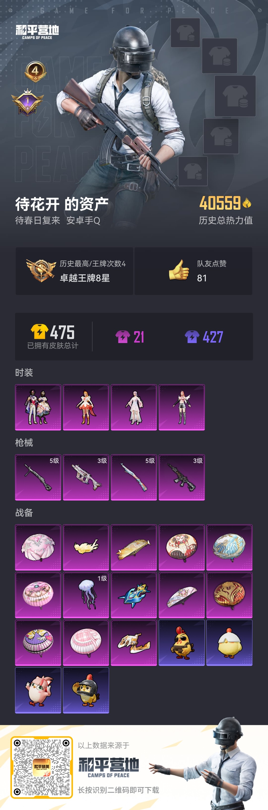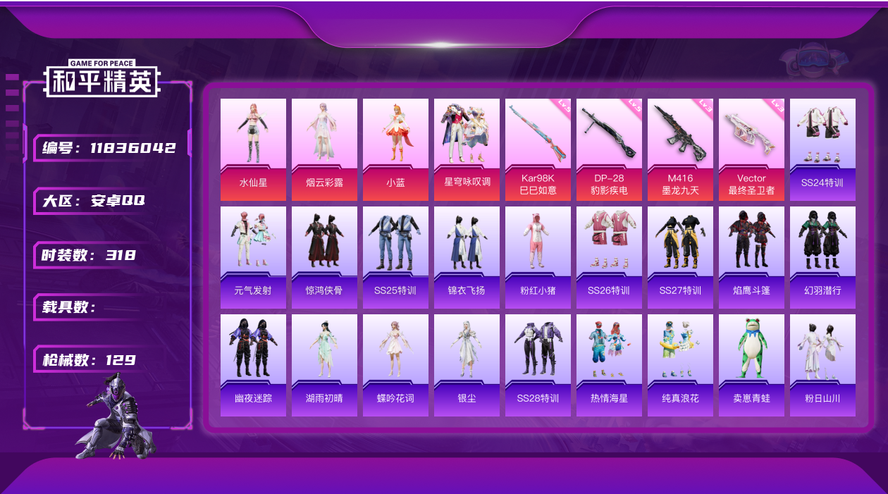- PX_2093415- 苹果手Q-13王牌印记-13粉装-6特效枪-3载具-57146热力值-128套装-140枪皮-2卓越印记-2传奇印记 【13粉装】,雪国幻梦,梦幻火箭,2号机款机体服,灵感创作师,童趣迷兔,洛天依,恐龙拽拽,千金淑猫,银龙傲海,百合蜜语,山涧鹿灵,暗翼战神,骨龙祭渊 【6特效枪】AKM-百合蜜语-7级 M16A4-垂柳戏鸭-2级 M416-风花雪月-7级 Kar98K-巳巳