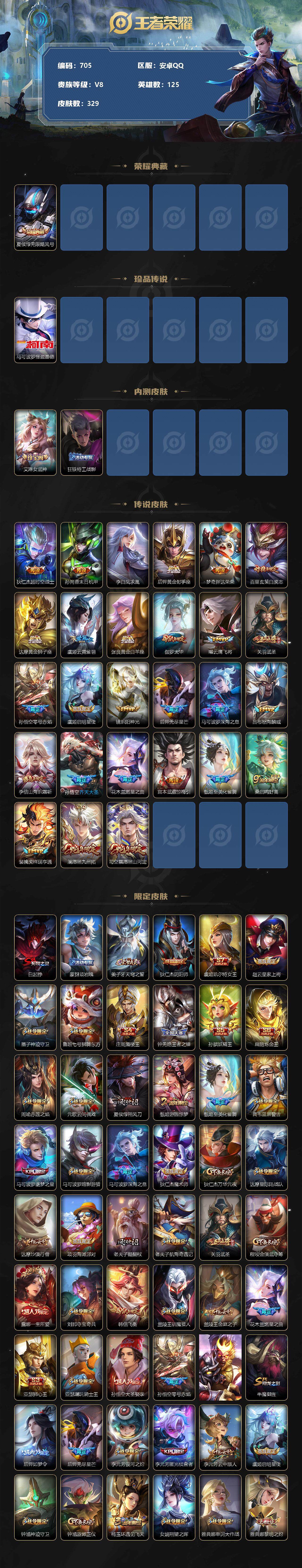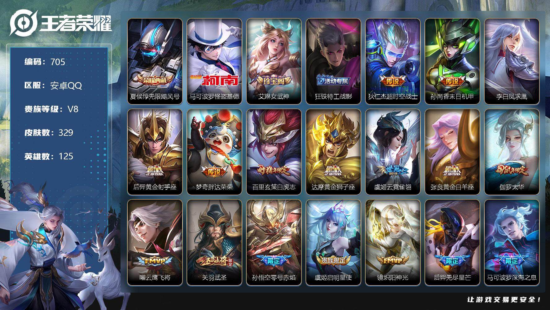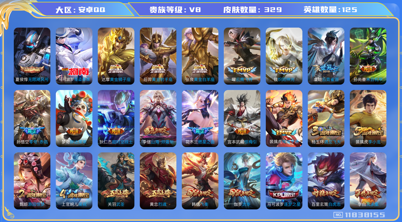 [11838155]【商品标题】:安卓Q-V8-至尊星耀I段位-125英雄-329皮肤-1典藏-0珍品无双-0无双-1珍品传说-27传说-92史诗