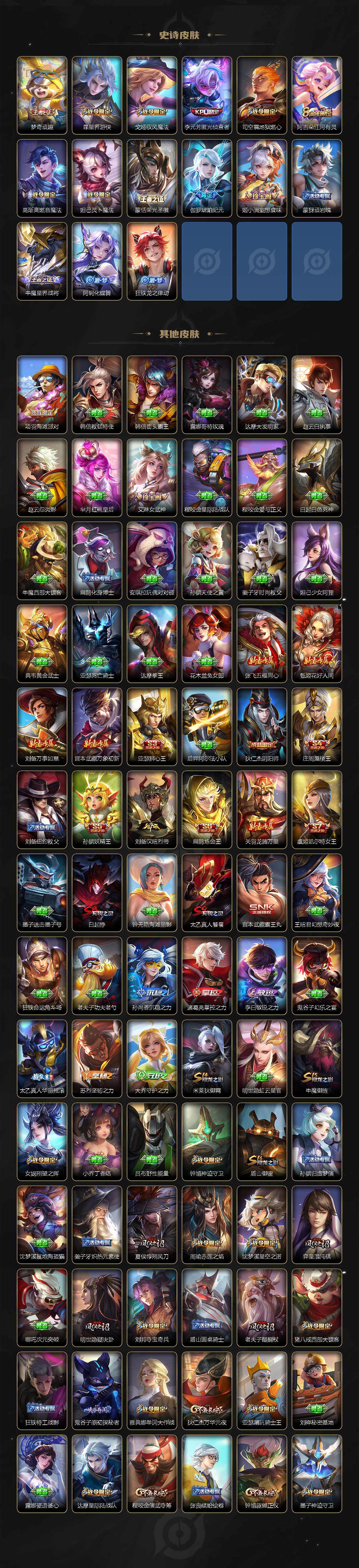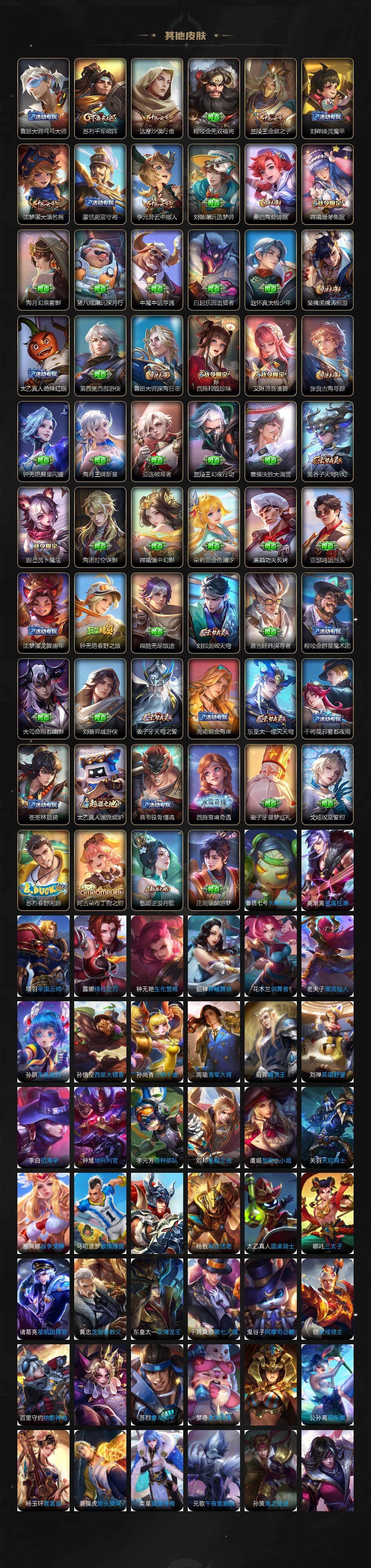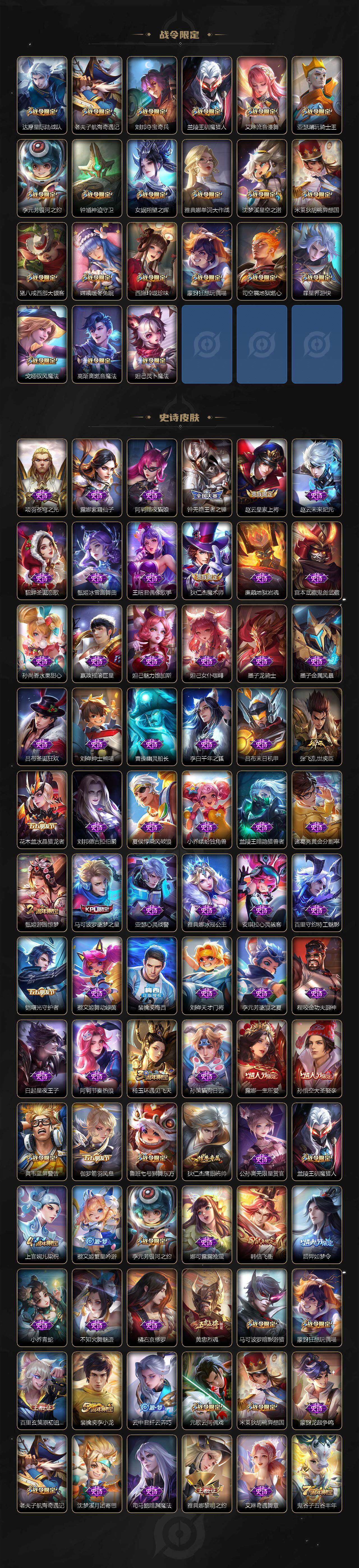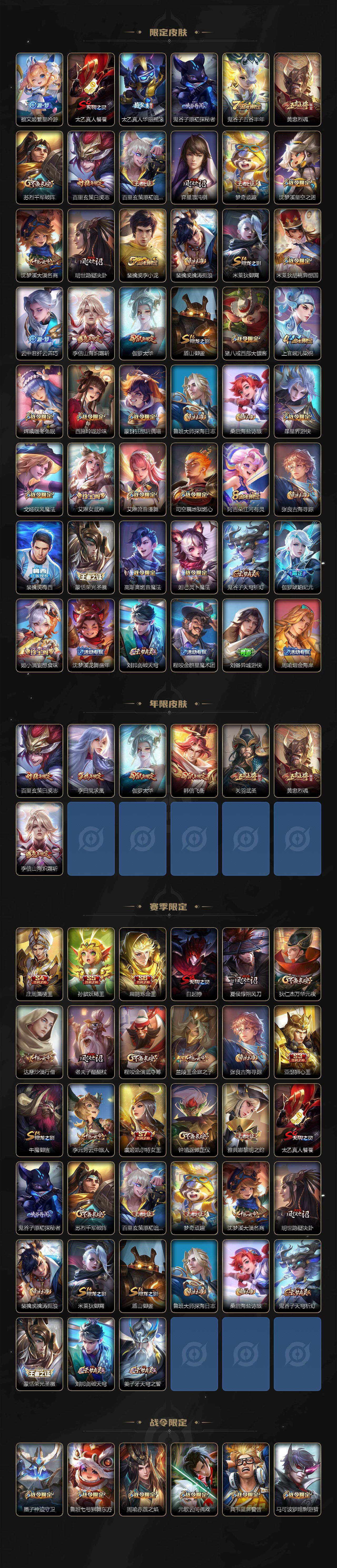 【限定皮肤】:白起狰,蒙犽顽岩魄,姜子牙天穹之誓,狄仁杰阴阳师,虞姬凯尔特女王,赵云皇家上将,墨子神迹守卫,鲁班七号狮舞东方,庄周蜃楼王,钟无艳王者之锤,孙膑妖精王,扁鹊炼金王,周瑜赤莲之焰,元歌云间偶戏,夏侯惇朔风刀,甄姬游园惊梦,甄姬至美化雀舞,典韦蓝屏警告,马可波罗逐梦之星,马可波罗暗影游猎,马可波罗深海之息,狄仁杰魔术师,狄仁杰万华元夜,达摩星际陆战队,达摩沙漠行僧,项羽海滩派对,老夫子醍醐杖,老夫子航海奇遇记,关羽武圣,程咬金演武夺筹,露娜一生所爱,刘邦夺宝奇兵,韩信飞衡,兰陵王驯魔猎人,兰陵王金庭之子,花木兰燃星之曲,亚瑟狮心王,亚瑟潮玩骑士王,孙悟空大圣娶亲,孙悟空零号赤焰,孙悟空齐天大圣,牛魔御旌,后羿如梦令,后羿无尽星芒,李元芳银河之约,李元芳匿光侦查者,李元芳云中旅人,虞姬启明星使,钟馗神迹守卫,钟馗驱傩正仪,杨玉环遇见飞天,女娲朔望之晖,雅典娜单词大作战,雅典娜黎明之约,蔡文姬繁星吟游,太乙真人饕餮,太乙真人华丽摇滚,鬼谷子原初探秘者,鬼谷子五谷丰年,黄忠烈魂,苏烈千军破阵,百里玄策白虎志,百里玄策原初追逐者,弈星混沌棋,梦奇顽趣,沈梦溪星空之诺,沈梦溪大漠名商,明世隐疑决卦,裴擒虎李小龙,裴擒虎擒涛扼浪,米莱狄御霄,米莱狄胡桃异想国,云中君纤云弄巧,李信山海炽霜斩,伽罗太华,盾山御銮,猪八戒西部大镖客,上官婉儿梁祝,嫦娥暖冬兔眠,西施玲珑珍味,蒙犽狂想玩偶喵,鲁班大师探海日志,桑启海盐诗旅,暃星界游侠,戈娅驭风魔法,艾琳女武神,艾琳流音漫舞,司空震地狱燃心,阿古朵江河有灵,张良古海寻踪,裴擒虎梅西,蒙恬荣光圣