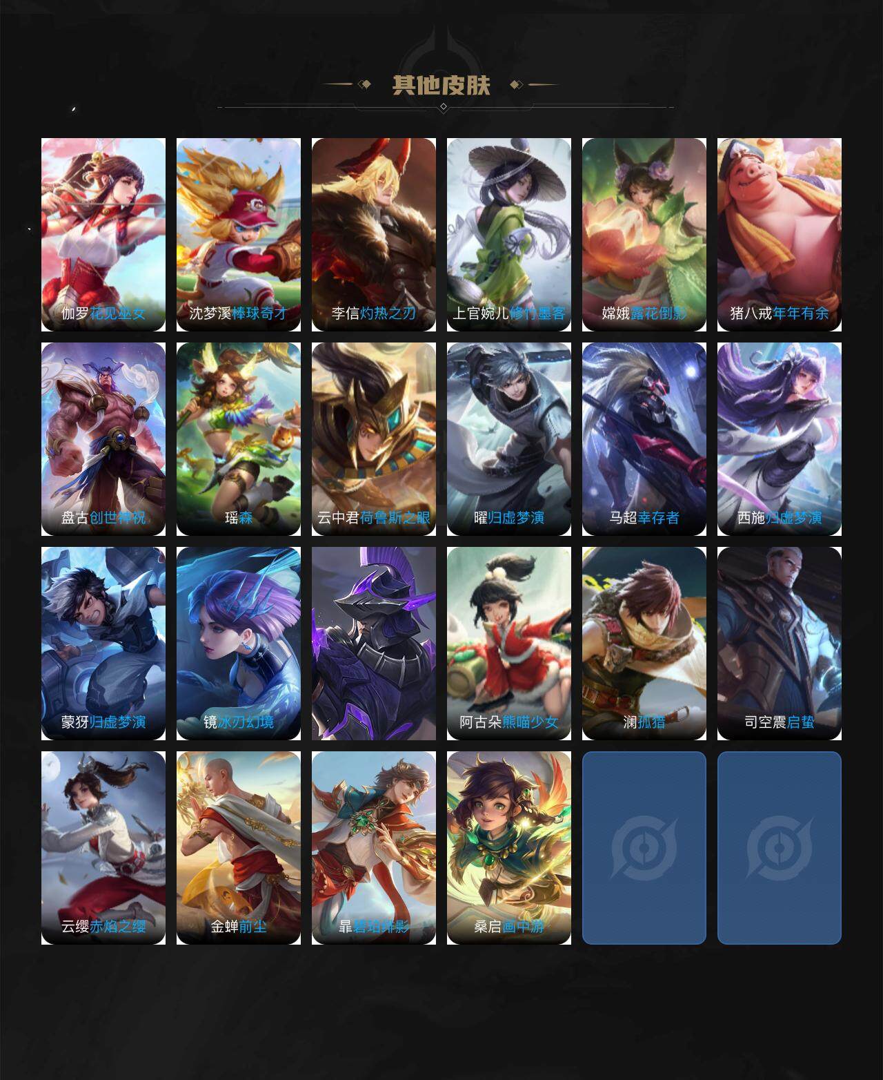 裴擒虎李小龙,上官婉儿梁祝,关羽武圣,黄忠烈魂,韩信飞衡,伽罗太华,马可波罗逐梦之星,百里玄策白虎志,孙悟空大圣娶亲,露娜一生所爱,后羿如梦令,裴擒虎梅西,后羿无尽星芒,马可波罗深海之息,甄姬至美·化雀舞,桑启鸣野蒿,澜愿照·九州拓,司空震愿照·山河定