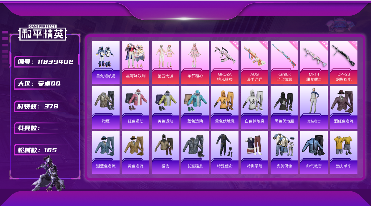 [11839402]3粉装 5特效枪 4印记 可二次 可修改实名 优质装备:GROZA-镜光银凌,AUG-暖羊咩咩,星穹咏叹调,MK14-甜梦熊击,羊梦糖心,Kar98K-巳巳如意 热门装扮:第五大道,星兔领航员 稀有枪皮:DP-28-豹影疾电 五级特效枪:五级GROZA-镜光银凌,五级Kar98K-巳巳如意,五级DP-28-豹影疾电,五级MK14-甜梦熊击,五级AUG-暖羊咩咩 紫色装扮:田园牧歌,轻风白浪,SS22特训,莱茵河畔,SS23特训,幻彩翩翩,灵蜜圈圈,妙红点点,娇憨猪猪,暖心橘喵,萌趣咩咩,SS21特训,绚烂繁星,SS31特训套装,冰川特警,云朵鹅,雪绒豹,SS33特训套装,SS20特训,飞驰魅影,音速流光,SS19特训,军刀雅典娜,豚鼠丹丹,甜心亚梦,虚音幻奏,水晶王族,酒红色名流,野性战心,长空猛禽,蓝色运动,飞行日记,魅力单车,麻辣教官,黄色伏地魔,黄色名流,黄色运动,黑色伏地魔,龟仙人,冰河战士,龙魂突击队,蝶变,极地朋克,柠萌假日,沙漠兵团,涂山之恋,清新柠檬,夏日音浪,完美偶像,帅气教官,幻世战舞者,探宝勇士,湖蓝色名流,绮丽涂鸦,白色伏地魔,空岛之星,红色运动,王牌教练,牛气冲天,炫蓝之夏,牛气满满,猛禽,特殊使命,特训学院,猎鹰,雏菊兔兔,萝兰蝴蝶,SS29特训,SS28特训,铁血战翼,鱼渊荷华,玉兔迎春,燕燕于飞,巳巳如意,风玲,都市丽猫,林月如,竞技名士,神气柴柴,懵萌河马,SS24特训(SS24特训套装),菲菲,超人强,焰鹰斗篷,幻羽潜行,SS27特训,SS26特训,春光漫游,智谋强哥,星影赞美诗,小鸟芋圆,蓝冰羽,紫幽梦,SS32特训服(SS32特训套装),萌黄之夏,恋语绒绒,金耀舞者,光之冒险 优质战备:星途旅人降落伞,未来领航者降落伞,庄周梦蝶降落伞,炙焰牛王降落伞,恐龙拽拽降落伞,橘柚倾心降落伞,夜幕颂歌飞行器,幻星舰长飞行器,智趣喵喵飞行器,临安公主降落伞,桃粉嫣然降落伞,筑梦精灵降落伞,环太平洋降落伞,翩跹演武降落伞,暗夜鎏金降落伞,纯梦嫁纱降落伞,第五大道降落伞