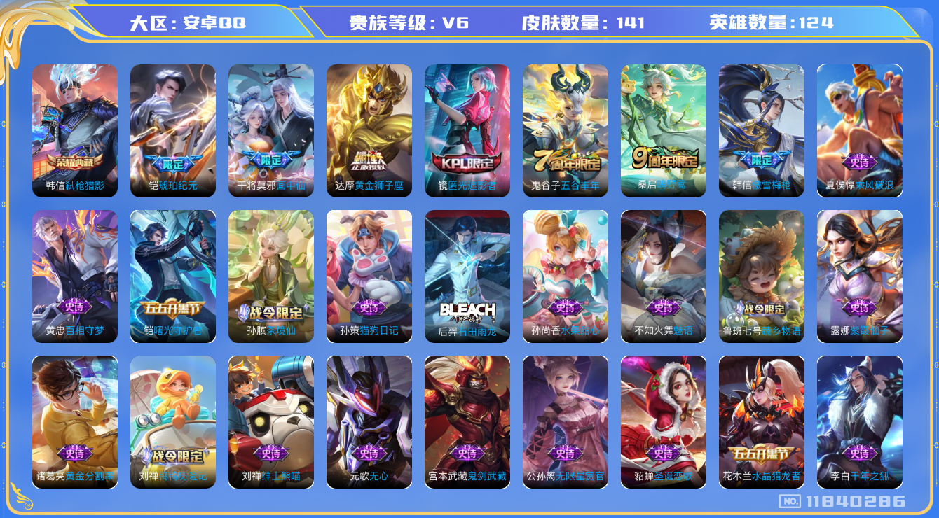 [11840286]V6 1典藏 4传说 124英雄 141皮肤 可修改实名 优质装备:弑枪猎影(韩信典藏),黄金狮子座,画中仙,琥珀纪元铠 珍宝阁皮:蔷薇恋人 限定皮:鸣野蒿,傲雪梅枪,五谷丰年,匿光追影者 史诗皮:鸭鸭历险记-刘禅,龙之律动,石田雨龙,茶境仙,蔬乡物语(鲁班七号),百相守梦-百里守约,百相守梦-黄忠,紫霞仙子,黄金分割率,千年之狐,魅语,无限星赏官,偶像歌手,猫狗日记-孙策,水果甜心,绅士熊喵,星夜王子,鬼剑武藏,天秀·启明,乘风破浪,逐浪之夏,水晶猎龙者,曙光守护者,金属风暴,圣诞恋歌,鹰眼统帅,魅力维加斯,赏金猎手,无心,未来纪元-赵云