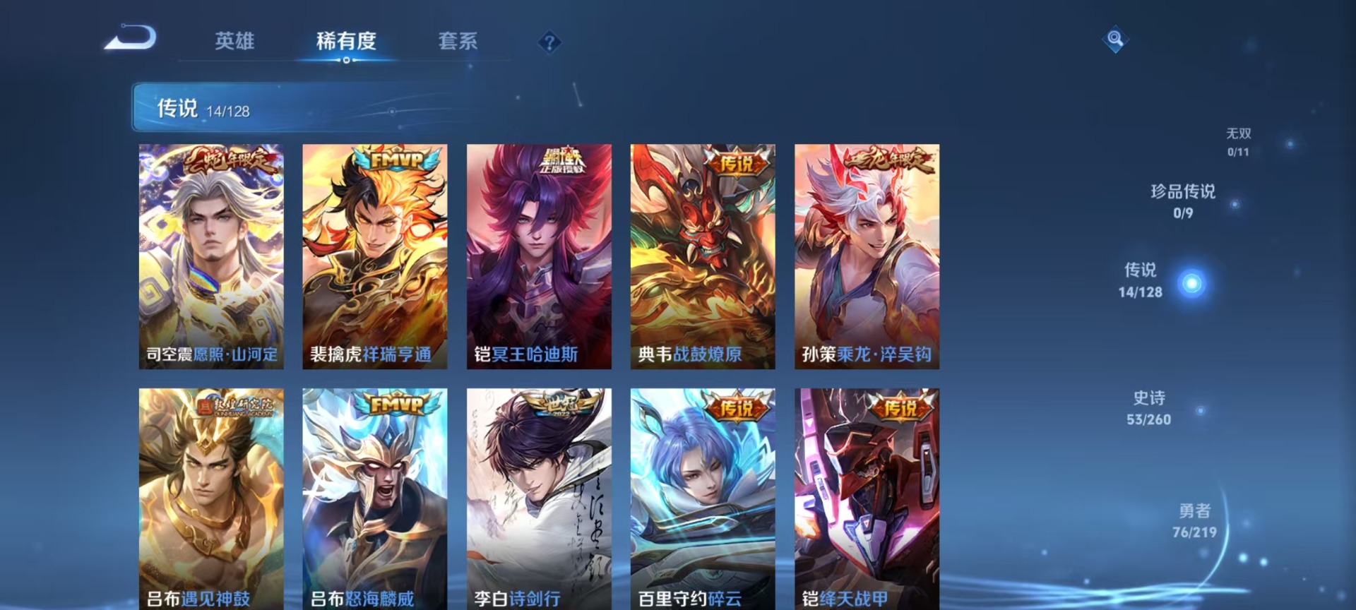 刘邦德古拉伯爵,夏侯惇乘风破浪,阿轲节奏热浪,铠曙光守护者,曹操幽灵船长,孙策猫狗日记,赵怀真器灵·浮梦炉,鲁班七号电玩小子,项羽苍穹之光,吕布圣诞狂欢,吕布末日机甲,司马懿暗渊魔法,刘禅绅士熊喵,宫本武藏鬼剑武藏,兰陵王暗隐猎兽者,花木兰水晶猎龙者,李白千年之狐,安琪拉心灵骇客,白起星夜王子,亚瑟心灵战警,嬴政摇滚巨星,韩信白龙吟,百里守约特工魅影,李元芳逐浪之夏,墨子龙骑士,墨子金属风暴,澜赏金猎手,王昭君偶像歌手,嫦娥拒霜思,橘右京修罗