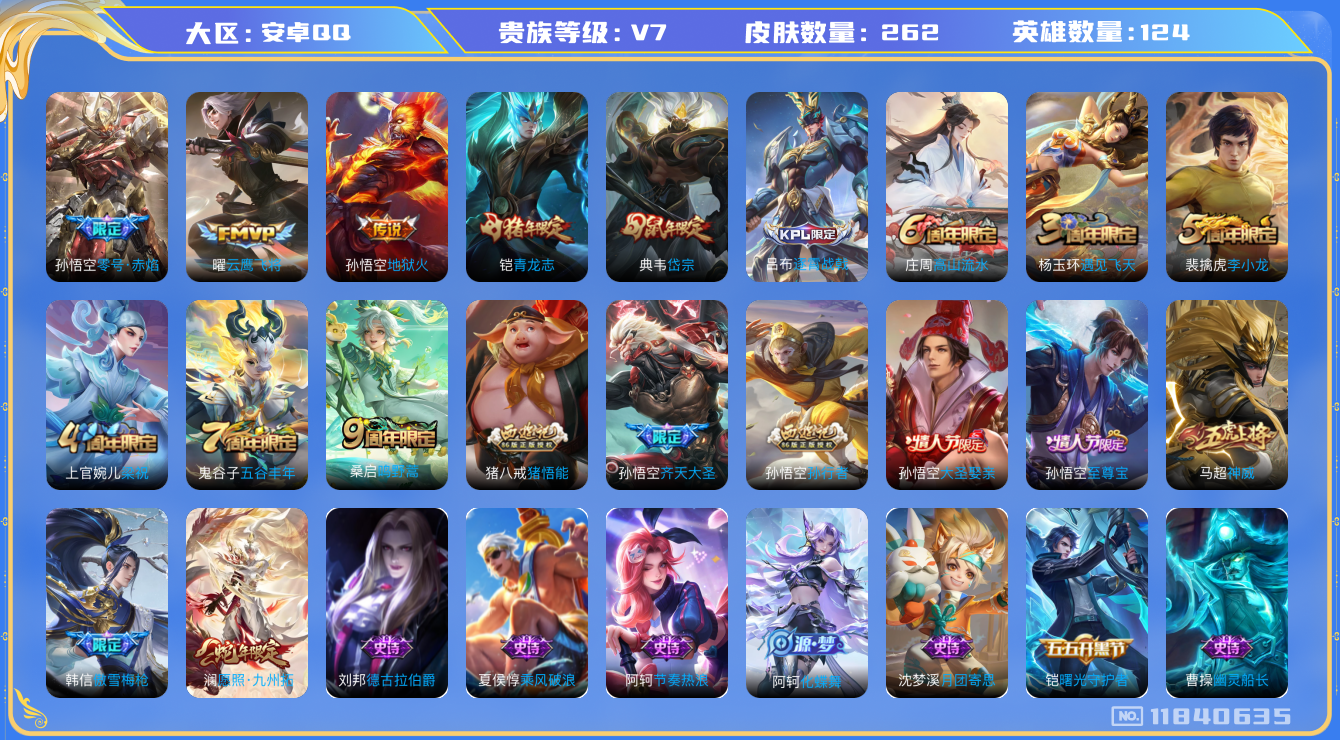 [11840635]V7 6传说 124英雄 262皮肤 可修改实名 优质装备:云鹰飞将(小将军),地狱火,零号·赤焰 珍宝阁皮:胡桃夹子,蔷薇恋人,女武神 限定皮:愿照·九州拓(澜年限),逐霄战戟,鸣野蒿,至尊宝,傲雪梅枪,神威(电光马子),遇见飞天,高山流水,齐天大圣,五谷丰年,青龙志(铠年限),梁祝,岱宗(典韦年限),李小龙,孙行者,猪悟能,大圣娶亲 史诗皮:器灵·浮梦炉,化蝶舞,灵蛊蚀心,石田雨龙,百相守梦-百里守约,紫霞仙子,苍穹之光,黄金分割率,特工魅影,千年之狐,江河有灵,百解令(蒙犽),无限星赏官,冰冠公主,晚萤,电玩·爆裂旋风,末日机甲-吕布,猫狗日记-孙策,乱世虎臣,节奏热浪,女仆咖啡,摇滚巨星,水果甜心,绅士熊喵,天才门将,星夜王子,心灵骇客,功夫厨神,德古拉伯爵,暗隐猎兽者,幽灵船长,鬼剑武藏,心灵战警,地狱岩魂,纤云弄巧,繁星吟游(呼啦呼啦),拒霜思,缤纷独角兽,乘风破浪,逐浪之夏,月团寄思,水晶猎龙者,曙光守护者,箭羽风息,金属风暴,原初追逐者,圣诞狂欢,圣诞恋歌,鹰眼统帅,魅力维加斯,黎明之约,未来纪元-赵云