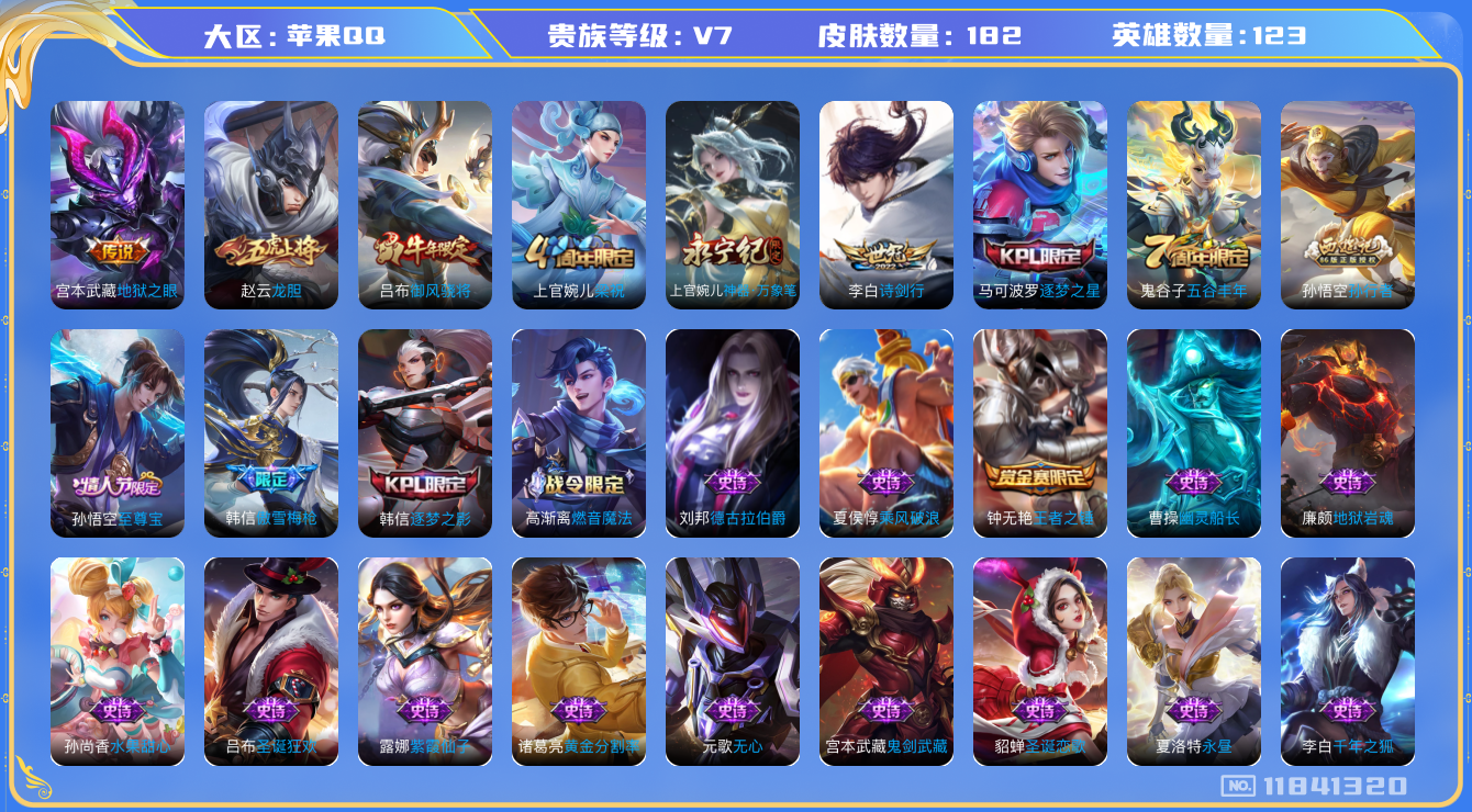 [11841320]V7 2传说 123英雄 182皮肤 可修改实名 优质装备:地狱之眼 珍宝阁皮:玩趣恶龙 限定皮:至尊宝,傲雪梅枪,诗剑行,五谷丰年,梁祝,御风骁将(吕布年限),龙胆,逐梦之星,逐梦之影,孙行者,神器·万象笔 史诗皮:紫霞仙子,黄金分割率,特工魅影,千年之狐,永昼,百解令(蒙犽),高渐离燃音魔法,修罗,水果甜心,星夜王子,功夫厨神,德古拉伯爵,幽灵船长,鬼剑武藏,地狱岩魂,乘风破浪,金属风暴,原初追逐者,圣诞狂欢,圣诞恋歌,鹰眼统帅,王者之锤,魅力维加斯,赏金猎手,无心,未来纪元-赵云