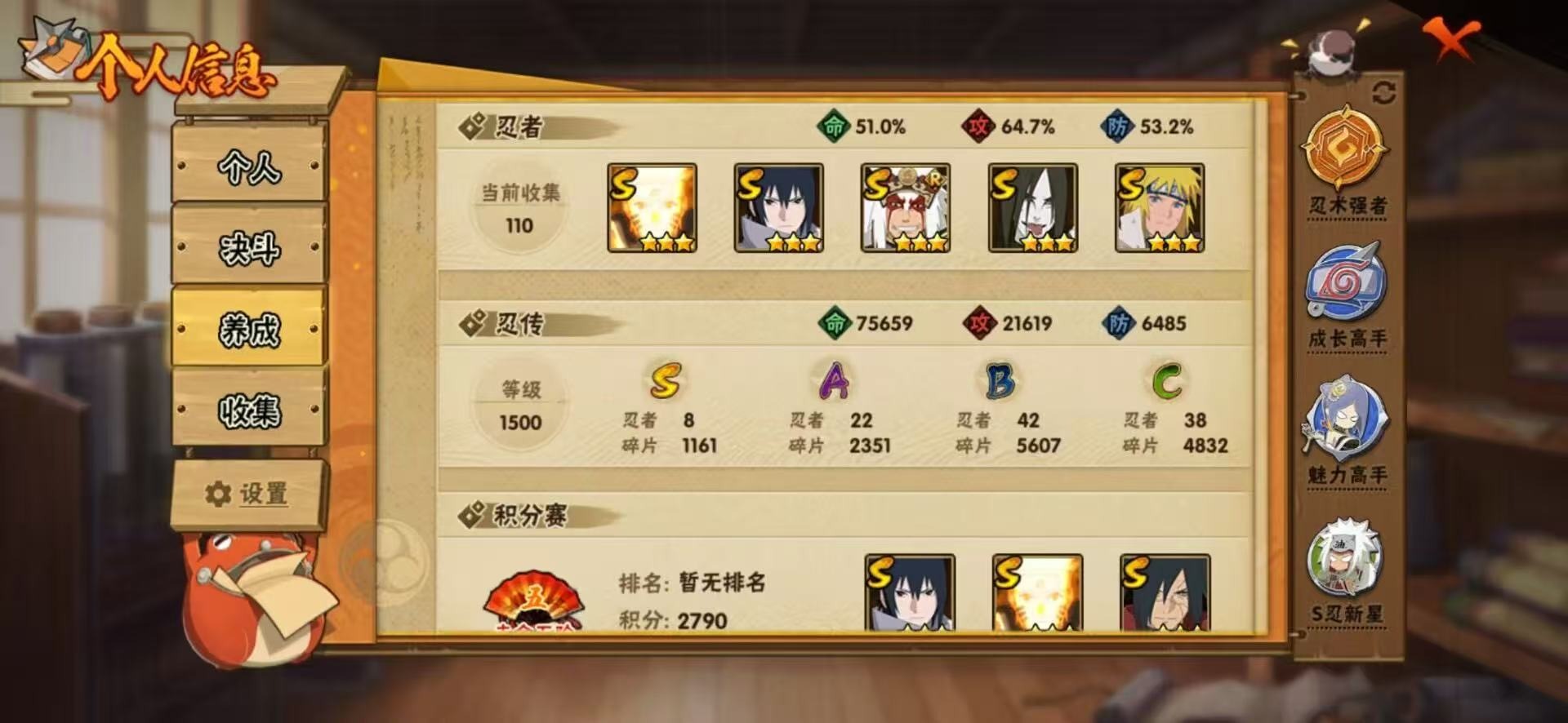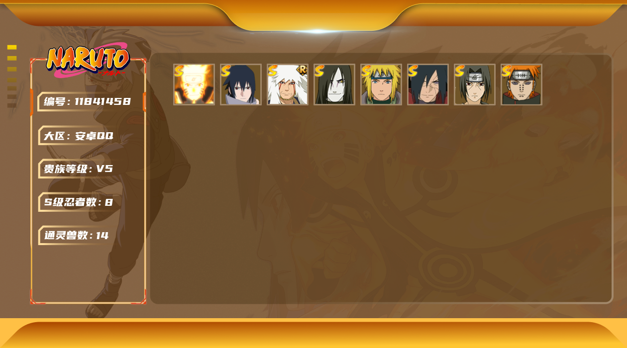 [11841458]V5 8S忍 20A忍 14通灵 613.5W战力 可二次 可修改实名 优质装备:漩涡鸣人 「九喇嘛连结」,宇智波佐助「永恒万花筒」,宇智波斑「秽土转生·解」 S级忍者:自来也 「舞之豪杰」,宇智波鼬 「须佐能乎」,佩恩「天道」,波风水门,大蛇丸
