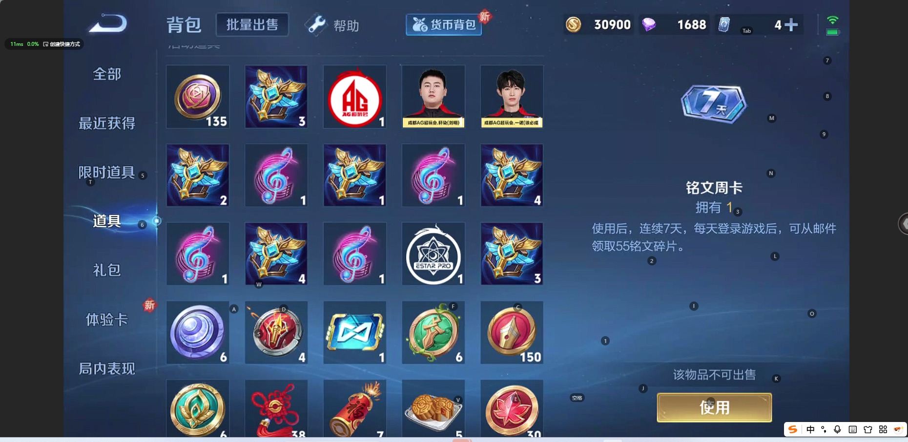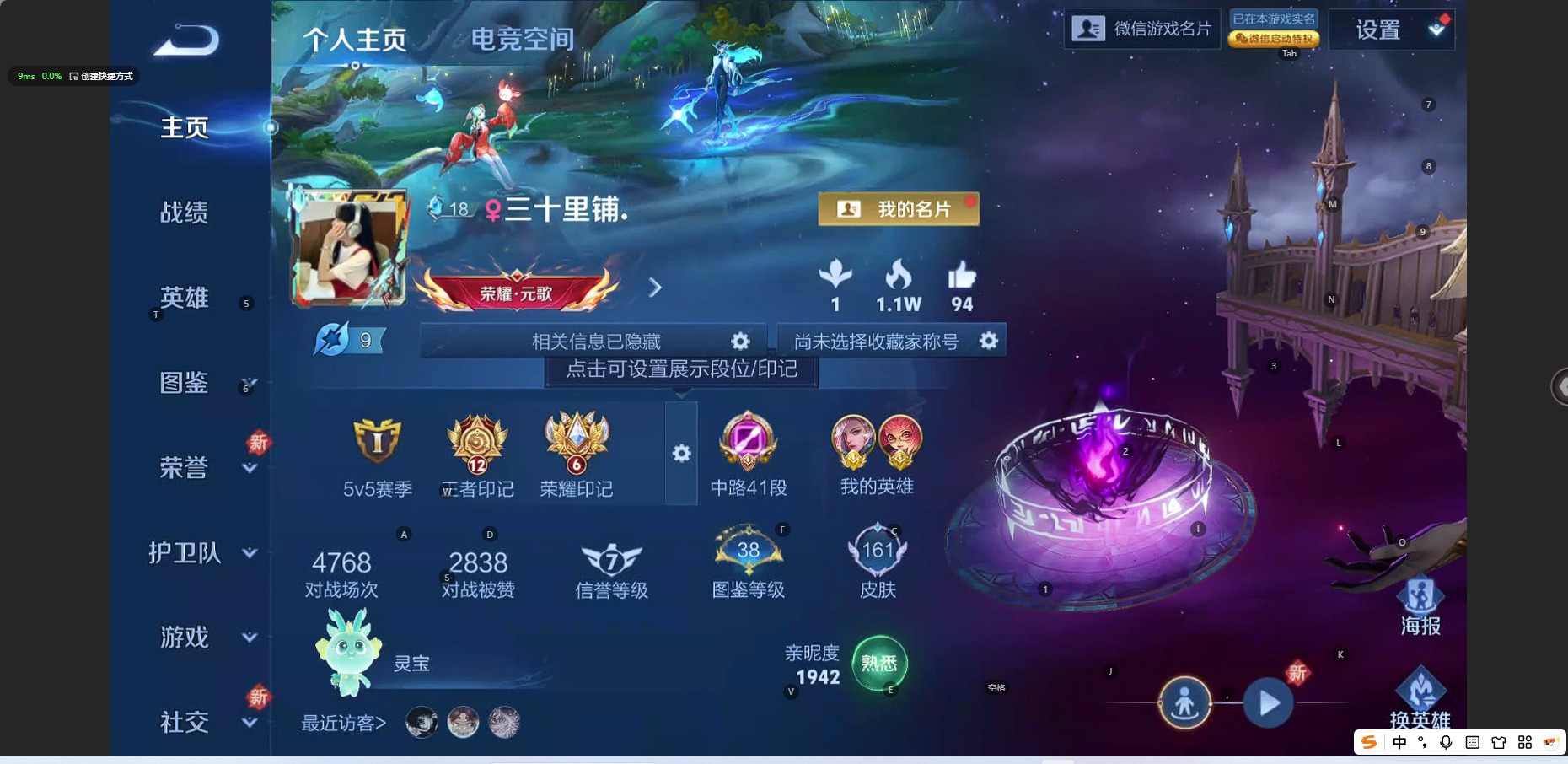 [11841741]V7 1典藏 8传说 125英雄 161皮肤 永久限制社交场景 优质装备:神鉴启示录,炽阳神光,末日机甲-孙尚香(绿蚂蚱),胖达荣荣,画中仙,记忆之芯(机甲兔),鹤羽星尊 传说皮:幻光神枪 珍宝阁皮:优雅恋人 限定皮:补天,魔法小厨娘,五谷丰年,梁祝,山海·玄木吟(马可年限) 史诗皮:星界战将,龙之律动,藏狐·褐绒,遇见神鹿,紫霞仙子,黄金分割率,江河有灵,魅语,高渐离燃音魔法,蒙恬荣光圣徽,冰冠公主,偶像歌手,电玩·爆裂旋风,末日机甲-吕布,猫狗日记-孙策,乱世虎臣,水果甜心,天才门将,星夜王子,心灵骇客,时之奇旅-安琪拉,鬼剑武藏,心灵战警,舞动绿茵,地狱岩魂,纤云弄巧,缤纷独角兽,乘风破浪,逐浪之夏,水晶猎龙者,唤灵魅影,金属风暴,原初追逐者,圣诞恋歌,鹰眼统帅,黎明之约,滕王阁序,无心,未来纪元-赵云1
