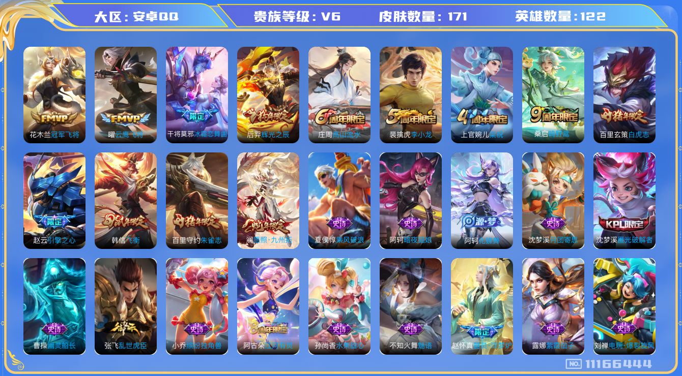 [11166444]V6 5传说 122英雄 171皮肤 可修改实名 女号 优质装备:冠军飞将,云鹰飞将(小将军) 珍宝阁皮:蔷薇恋人,玩趣恶龙 限定皮:愿照·九州拓(澜年限),鸣野蒿,白虎志(电光耗子),飞衡(韩信年限),高山流水,梁祝,李小龙,朱雀志(守约年限),辉光之辰,引擎之心,冰霜恋舞曲 史诗皮:器灵·浮梦炉,化蝶舞,紫霞仙子,特工魅影,千年之狐,匿光破解者,电玩·爆裂旋风,江河有灵,百解令(蒙犽),蒙恬荣光圣徽,暗夜猫娘,魅语,冰冠公主,乱世虎臣,修罗,摇滚巨星,水果甜心,绅士熊喵,星夜王子,心灵骇客,功夫厨神,暗隐猎兽者,幽灵船长,鬼剑武藏,纤云弄巧,缤纷独角兽,乘风破浪,月团寄思,金属风暴,原初追逐者,圣诞恋歌,鹰眼统帅,魅力维加斯