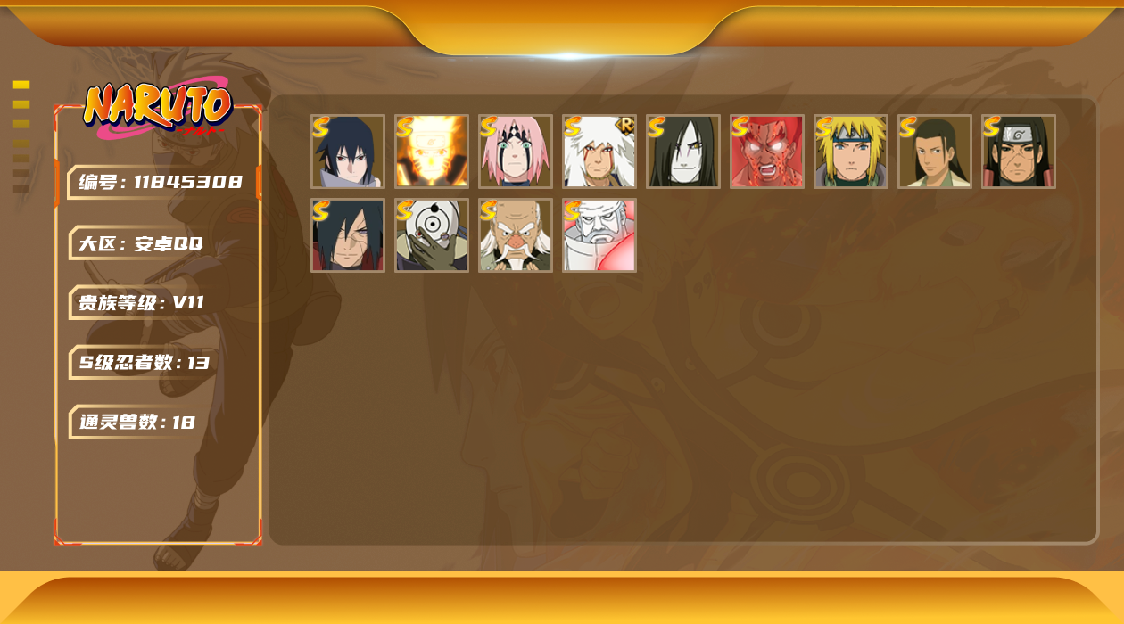 [11845308]V11 13S忍 28A忍 18通灵 361.3W战力 可二次 可修改实名 优质装备:熊猫,千手柱间「秽土转生」,迈特凯「死门」,“宇智波斑” 「白面具」,漩涡鸣人 「九喇嘛连结」,大筒木金式「博人传」,春野樱 「忍界大战」,宇智波佐助「永恒万花筒」,千手柱间·木叶创立,宇智波斑「秽土转生·解」 S级忍者:大野木 「忍界大战」,自来也 「舞之豪杰」,波风水门,大蛇丸