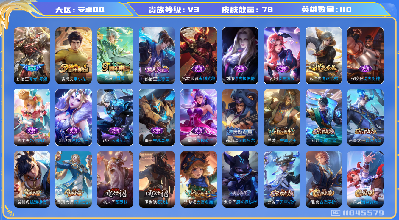 - [11685071]V8 1典藏 12传说 125英雄 349皮肤 可修改实名 优质装备:鸣剑·曳影,黄金狮子座,黄金射手座,冠军飞将,云鹰飞将(小将军),地狱火,零号·赤焰,李逍遥,澜逐花归海 珍宝阁皮:万物之道,优雅恋人,玩趣恶龙 限定皮:鸣野蒿,白虎志(电光耗子),傲雪梅枪,瑞麟志(木兰年限),高山流水,五谷丰年,青龙志(铠年限),冰锋战神,武圣,梁祝,李小龙,逐梦之影,玄武志(苏烈年限),朱雀志(守约年限),霸王别姬-项羽,默契交锋-花木兰,猪悟能,一生所爱,大圣娶亲,青春决赛季,冰霜恋舞曲,蜜橘之夏,寅虎·心曲(虎婆) 史诗皮:星界战将,龙之律动,蔬乡物语(鲁班七号),超元猎域,百相守梦-黄忠,紫霞仙子,苍穹之光,白龙吟,黄金分割率,特工魅影,电玩·爆裂旋风,百解令(蒙犽),蒙恬荣光圣徽,偶像歌手,暗夜猫娘,末日机甲-吕布,猫狗日记-孙策,乱世虎臣,节奏热浪,修罗,女仆咖啡,摇滚巨星,水果甜心,绅士熊喵,天才门将,星夜王子,心灵骇客,功夫厨神,德古拉伯爵,暗隐猎兽者,幽灵船长,鬼剑武藏,暗渊魔法,心灵战警,天秀·启明,地狱岩魂,纤云弄巧,繁星吟游(呼啦呼啦),拒霜思,缤纷独角兽,乘风破浪,逐浪之夏,水晶猎龙者,曙光守护者,热力回旋,金属风暴,原初追逐者,圣诞狂欢,圣诞恋歌,鹰眼统帅,暗夜贵公子,魅力维加斯,黎明之约,无心,未来纪元-赵云