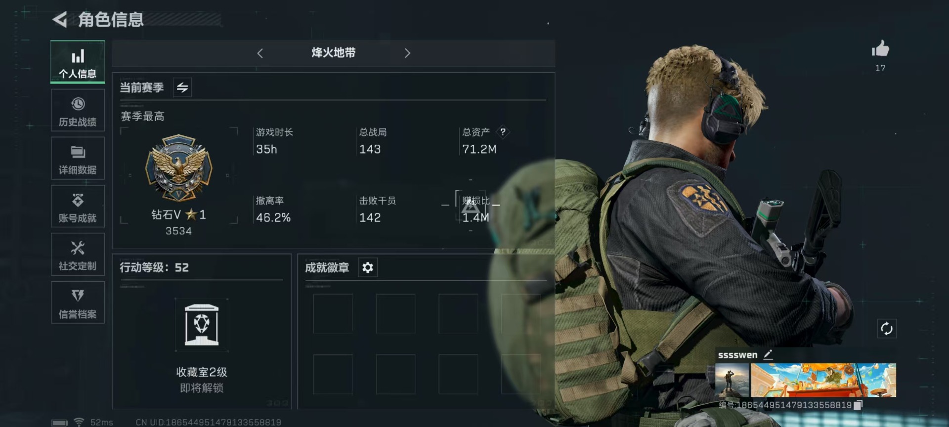 [11845895]总资产:71.2 1传说枪械 进阶安全箱(9.17到期) 可二次 可修改实名 烽火地带段位:钻石 全面战场段位:无段位 哈夫币:46.970 传说武器皮肤:复合弓-黑-天际线