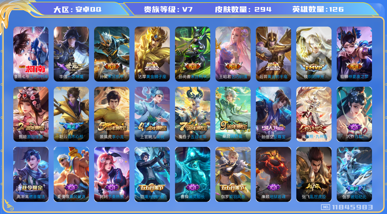 [11845983]V7 1珍品传说 10传说 126英雄 294皮肤 典藏英雄武则天 可修改实名 优质装备:江户川柯南,黄金狮子座,黄金射手座,炽阳神光,一念神魔,末日机甲-孙尚香(绿蚂蚱),仲夏夜之梦(大飞蛾),乞巧织情,末日机甲-孙策 珍宝阁皮:胡桃夹子 限定皮:愿照·九州拓(澜年限),鸣野蒿,至尊宝,五谷丰年,游园惊梦,梁祝,李小龙,百木心枪 史诗皮:器灵·浮梦炉,灵蛊蚀心,星界战将,茶境仙,破空之剑,战舞者,蒙犽顽岩魄,琥珀纪元伽罗,紫霞仙子,白龙吟,黄金分割率,特工魅影,千年之狐,江河有灵,百解令(蒙犽),高渐离燃音魔法,无限星赏官,冰冠公主,偶像歌手,白蛇,末日机甲-吕布,猫狗日记-孙策,时之恋人-孙尚香,乱世虎臣,节奏热浪,修罗,女仆咖啡,摇滚巨星,水果甜心,绅士熊喵,天才门将,星夜王子,功夫厨神,暗隐猎兽者,幽灵船长,鬼剑武藏,心灵战警,乐园奇幻夜,天秀·启明,舞动绿茵,地狱岩魂,纤云弄巧,繁星吟游(呼啦呼啦),缤纷独角兽,乘风破浪,逐浪之夏,水晶猎龙者,曙光守护者,箭羽风息,金属风暴,原初追逐者,圣诞狂欢,圣诞恋歌,鹰眼统帅,魅力维加斯,黎明之约,未来纪元-赵云