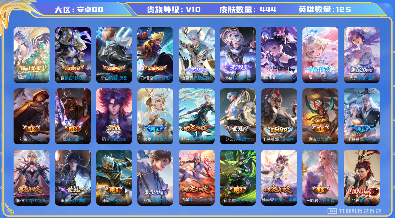 [11846262]V10 3典藏 1珍品无双 2无双 2珍品传说 68传说 125英雄 444皮肤 可修改实名 优质装备:馥梦繁花,鸣剑·曳影,全息碎影(猴子典藏),银白咏叹调(倪克斯侍卫),韩信群星魔术团(韩信无双),天机白泽,酷洛米之心,大耳狗之梦,黄金射手座,云鹰飞将(小将军),绛天战甲(鸡嘴战神),猫影幻舞,久胜战神,炽阳神光,一念神魔,云霓雀翎,末日机甲-孙尚香(绿蚂蚱),地狱火,仲夏夜之梦(大飞蛾),零号·赤焰,音你心动-周瑜,胖达荣荣,李逍遥,乞巧织情,时之恋人-刘备(电焊工),游龙清影(小青龙),淬星耀世,超时空战士-狄仁杰,遇见胡旋,末日机甲-孙策,挚爱之约,挚爱花嫁,山海·炽霜斩(李信年限),炽翼辉光(娃娃菜牛角包),燃星之曲,画中仙,鹤羽星尊,妄想实况,遇见神鼓,艾琳觅芳踪,朵莉亚心动手记,玄雷天君,涂山容容 传说皮:乘龙·问璇玑(孙尚香年限),乘龙·铭钟鼎(赵云年限),乘龙·淬吴钩(孙策年限),貂蝉曦玄引,吕布曦玄引,典韦战鼓燎原,九山相柳,铠冥王哈迪斯,续相思,幻光神枪 珍宝阁皮:妄想食味,蔷薇恋人,女武神 限定皮:愿照·九州拓(澜年限),愿照·福禄聚(蔡文姬年限),愿照·岁时盈(虞姬年限),愿照·山河定(司空震年限),愿照·众生和(妲己年限),愿照·千秋盛(女娲年限),逐霄战戟,映山客,陌上桑,鸣野蒿,夏侯惇霜北刀,至尊宝,太华(伽罗年限),武陵仙君(小桃花),异界灵契(白毛香),傲雪梅枪,补天,白鹤梁神女,魔法小厨娘,神威(电光马子),飞衡(韩信年限),山海·碧波行(瑶年限),无限倾心-项羽,高山流水,诗剑行,无限倾心-虞姬,齐天大圣,五谷丰年,武圣,游园惊梦,龙胆,烈魂,天狼溯光者,李小龙,逐梦之影,永曜之星,辉光之辰,孙行者,猪悟能,青春决赛季,乒乒小将,匿光追影者,女儿国国王,寅虎·瑞焰(虎皮蛋子),时之祈愿-云中君,时之祈愿-瑶(瑶传限),百木心枪,玉兔公主,启示之音,无尽星芒,唐三藏,山海·玄木吟(马可年限) 史诗皮:赞萌露比,鸭鸭历险记-刘禅,器灵·浮梦炉,瑰影绮梦,化蝶舞,灵蛊蚀心,星界战将,谪仙醉月,龙之律动,小牛鸭,百相守梦-周瑜,戍鼓铭心,幻珠鲛人,怒海争锋,破空之剑,涂山红红,东方月初,埋骨钱,芈月浮光幕影,海诺心动手记,琥珀纪元伽罗,决胜骁骑,蔬乡物语(鲁班七号),百相守梦-百里守约,百相守梦-黄忠,织梦人,遇见神鹿,紫霞仙
