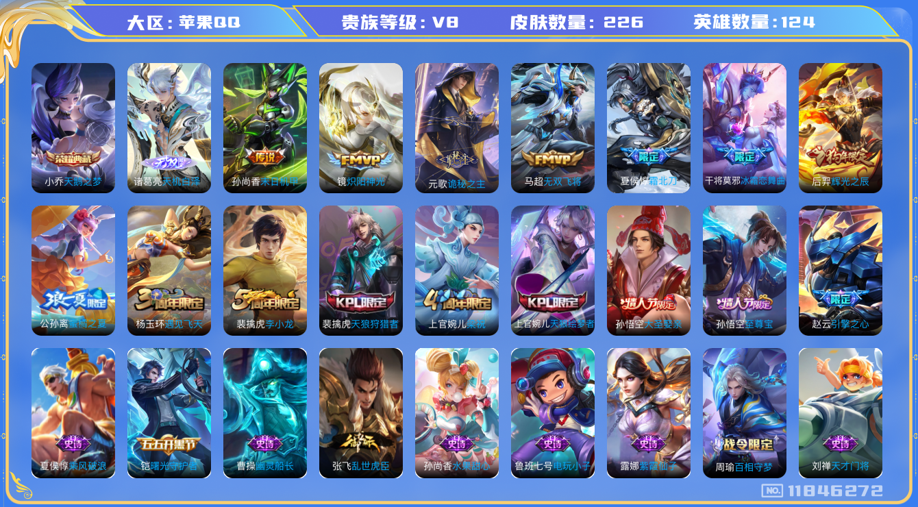 [11846272]V8 1典藏 1无双 6传说 124英雄 226皮肤 可修改实名 孙悟空大国标 优质装备:天鹅之梦(小乔典藏),天机白泽,炽阳神光,末日机甲-孙尚香(绿蚂蚱),无双飞将,诡秘之主 珍宝阁皮:优雅恋人 限定皮:夏侯惇霜北刀,至尊宝,遇见飞天,梁祝,天狼狩猎者,天狼绘梦者,李小龙,辉光之辰,大圣娶亲,引擎之心,冰霜恋舞曲,蜜橘之夏 史诗皮:龙之律动,百相守梦-周瑜,紫霞仙子,电玩小子(小书包),特工魅影,蒙恬荣光圣徽,冰冠公主,偶像歌手,乱世虎臣,修罗,女仆咖啡,水果甜心,绅士熊喵,天才门将,星夜王子,功夫厨神,暗隐猎兽者,幽灵船长,鬼剑武藏,繁星吟游(呼啦呼啦),乘风破浪,曙光守护者,原初追逐者,鹰眼统帅,魅力维加斯,赏金猎手,未来纪元-赵云
