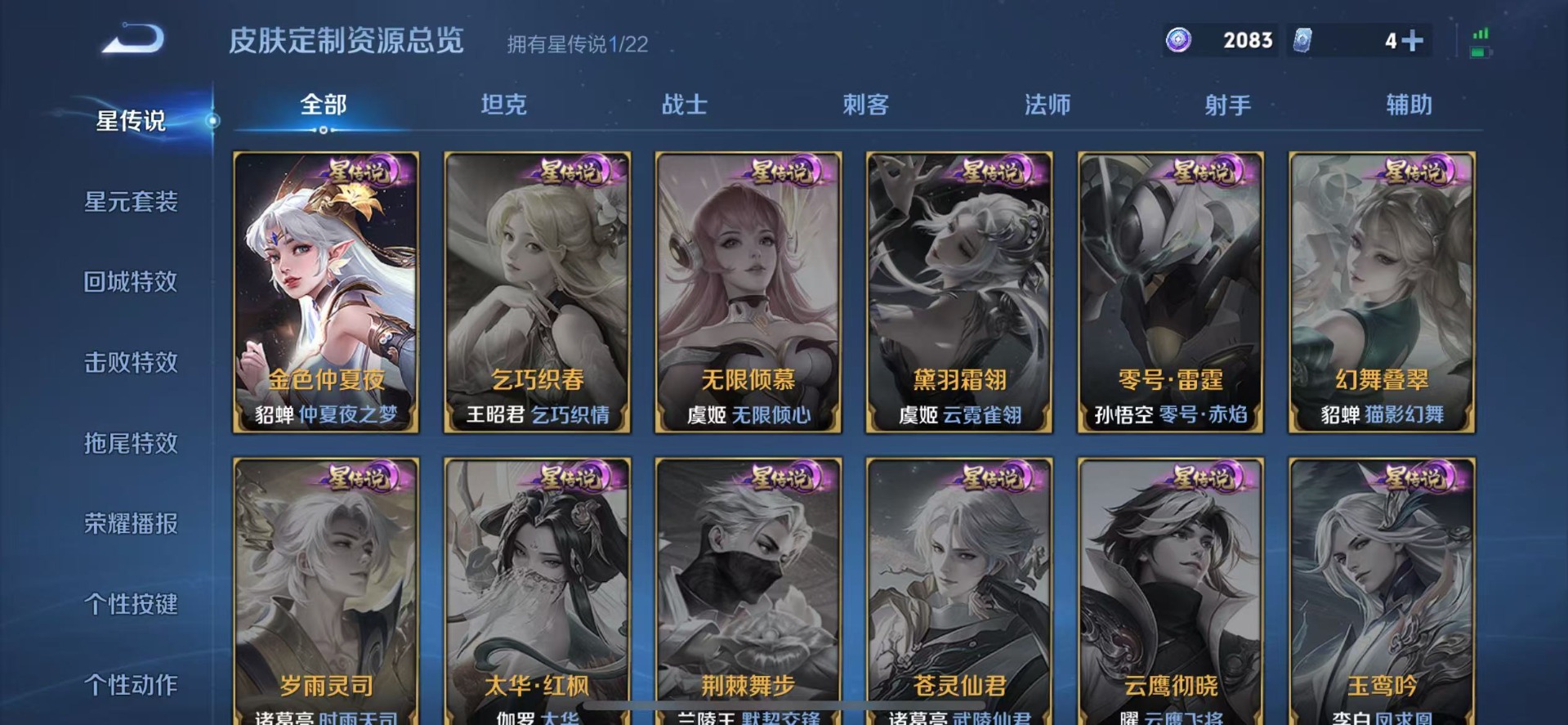 伽罗太华,典韦岱宗,后羿辉光之辰,诸葛亮时雨天司,裴擒虎李小龙,上官婉儿梁祝,上官婉儿天狼绘梦者,马可波罗深海之息,桑启鸣野蒿,孙悟空孙行者,孙悟空至尊宝,马超神威,妲己时之彼端,韩信傲雪梅枪,韩信飞衡,韩信逐梦之影,百里守约朱雀志,澜愿照·九州拓,关羽武圣
