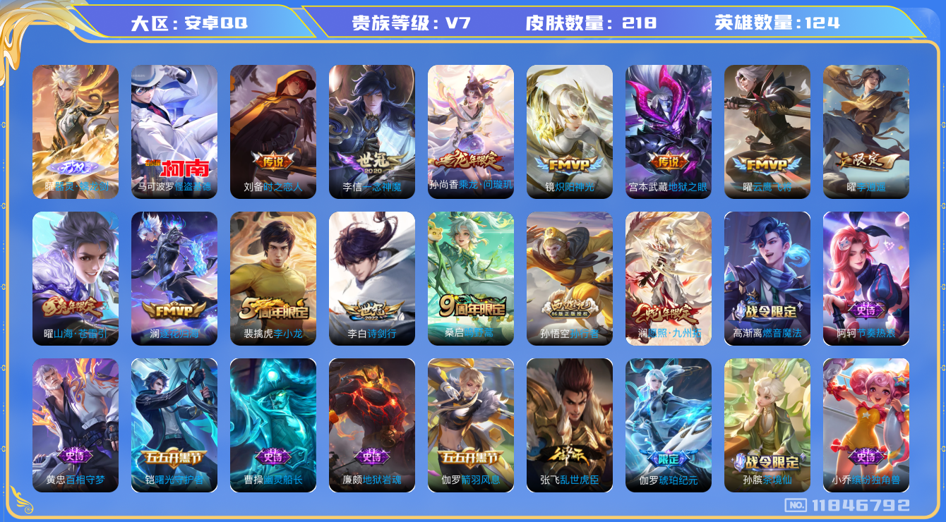 [11846792]V7 1无双 1珍品传说 12传说 124英雄 218皮肤 可修改实名 优质装备:器灵·螭龙剑,怪盗基德,云鹰飞将(小将军),炽阳神光,一念神魔,地狱之眼,李逍遥,时之恋人-刘备(电焊工),山海·苍雷引(电光曜子),澜逐花归海 传说皮:乘龙·问璇玑(孙尚香年限) 珍宝阁皮:妄想食味,蔷薇恋人 限定皮:愿照·九州拓(澜年限),鸣野蒿,诗剑行,李小龙,孙行者 史诗皮:器灵·浮梦炉,茶境仙,破空之剑,琥珀纪元伽罗,蔬乡物语(鲁班七号),超元猎域,百相守梦-百里守约,百相守梦-黄忠,紫霞仙子,黄金分割率,特工魅影,永昼,百解令(蒙犽),高渐离燃音魔法,晚萤,电玩·爆裂旋风,乱世虎臣,节奏热浪,修罗,女仆咖啡,摇滚巨星,水果甜心,绅士熊喵,功夫厨神,暗隐猎兽者,幽灵船长,鬼剑武藏,心灵战警,乐园奇幻夜,地狱岩魂,纤云弄巧,拒霜思,缤纷独角兽,逐浪之夏,曙光守护者,箭羽风息,鹰眼统帅,魅力维加斯