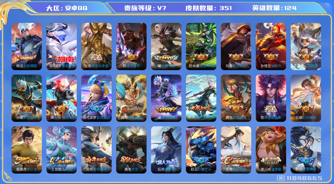 [11848665]【商品标题】:安卓Q-V7-最强王者段位-124英雄-351皮肤-1典藏-0珍品无双-0无双-1珍品传说-20传说-114史诗