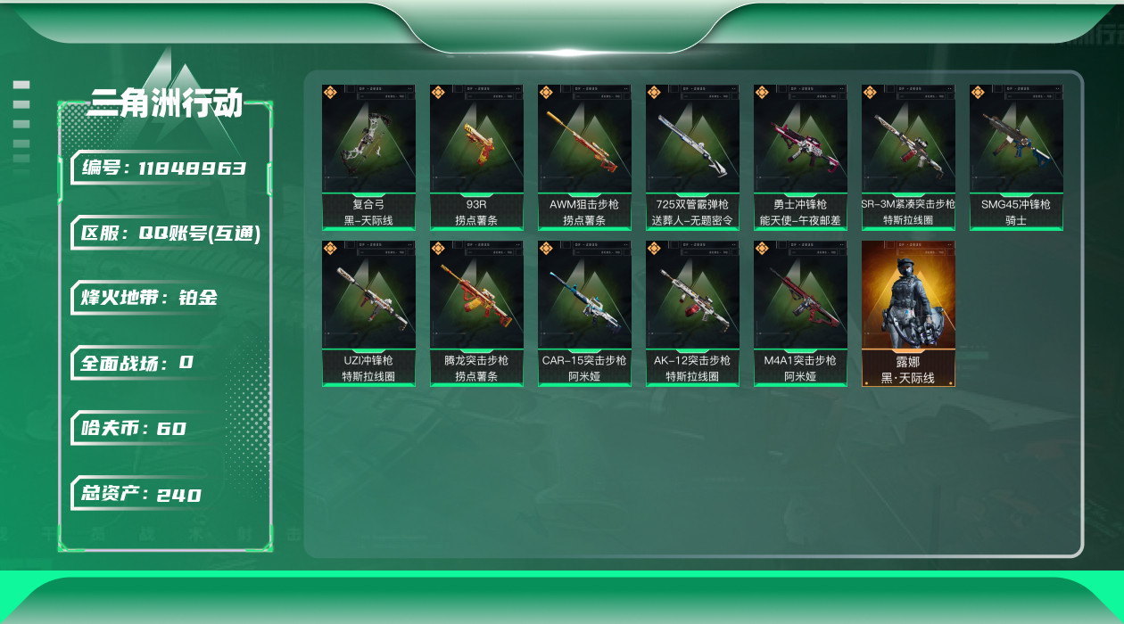 [11848963]总资产:240.6M 1干员外观 12传说枪械 哈夫币:60.089K 可二次 可修改实名 优质装备:顶级安全箱(3x3) 烽火地带段位:铂金 全面战场段位:无段位 传说武器皮肤:SMG45冲锋枪-骑士,UZI冲锋枪-特斯拉线圈,AWM狙击步枪-捞点薯条,腾龙突击步枪-捞点薯条,93R-捞点薯条,AK-12突击步枪-特斯拉线圈,SR-3M紧凑突击步枪-特斯拉线圈,勇士冲锋枪-能天使-午夜邮差,复合弓-黑-天际线,725双管霰弹枪-送葬人-无题密令,M4A1突击步枪-阿米娅,CAR-15突击步枪-阿米娅 干员外观:露娜-黑·天际线