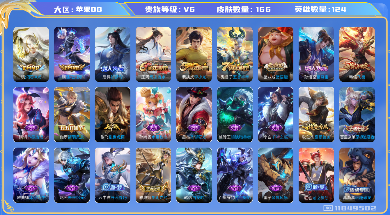 [11849502]V6 2传说 124英雄 166皮肤 可修改实名 优质装备:炽阳神光,澜逐花归海 珍宝阁皮:玩趣恶龙 限定皮:至尊宝,飞衡(韩信年限),高山流水,五谷丰年,李小龙,如梦令-后羿,猪悟能 史诗皮:龙之律动,白龙吟,特工魅影,千年之狐,冰冠公主,乱世虎臣,节奏热浪,水果甜心,暗隐猎兽者,纤云弄巧,箭羽风息,金属风暴,原初追逐者,圣诞狂欢,鹰眼统帅,黎明之约,未来纪元-赵云