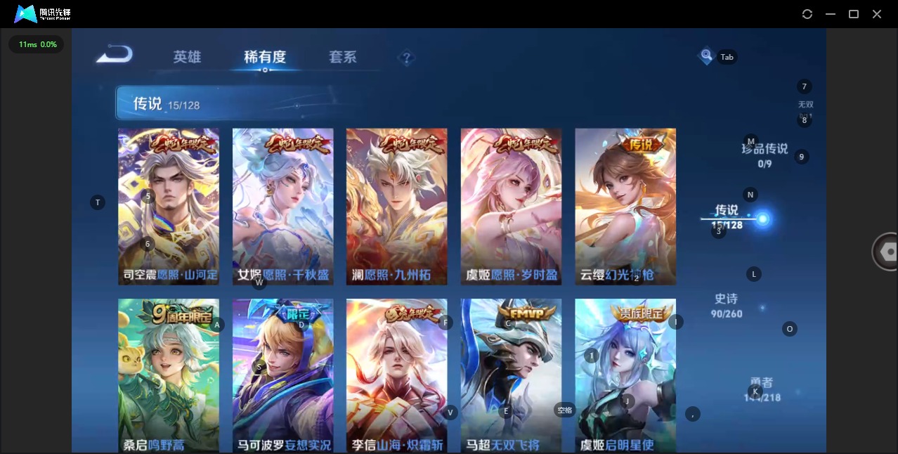 - [11471830]V3 4传说 108英雄 76皮肤 可修改实名 优质装备:绛天战甲(鸡嘴战神) 传说皮:幻光神枪 限定皮:愿照·九州拓(澜年限),鸣野蒿 史诗皮:器灵·浮梦炉,化蝶舞,星界战将,龙之律动,百相守梦-黄忠,紫霞仙子,末日机甲-吕布,节奏热浪,水果甜心,绅士熊喵,鬼剑武藏,舞动绿茵,乘风破浪,曙光守护者,鹰眼统帅,魅力维加斯,未来纪元-赵云