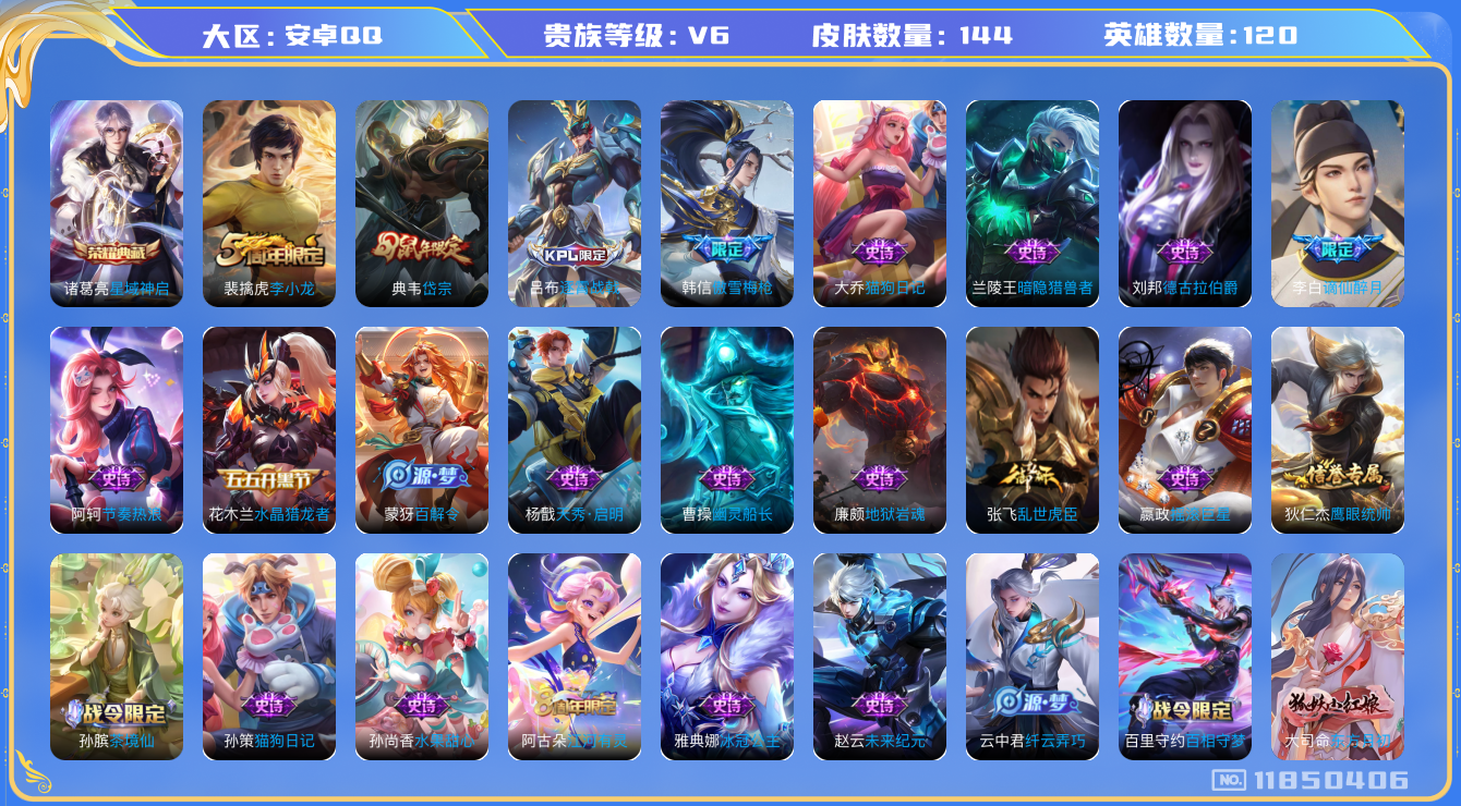 [11850406]V6 1典藏 120英雄 144皮肤 可修改实名 优质装备:星域神启(倪克斯贼亮) 限定皮:逐霄战戟,傲雪梅枪,岱宗(典韦年限),李小龙 史诗皮:鸭鸭历险记-刘禅,谪仙醉月,龙之律动,茶境仙,东方月初,百相守梦-百里守约,紫霞仙子,江河有灵,百解令(蒙犽),冰冠公主,偶像歌手,猫狗日记-孙策,猫狗日记-大乔,乱世虎臣,节奏热浪,修罗,摇滚巨星,水果甜心,天才门将,德古拉伯爵,暗隐猎兽者,幽灵船长,天秀·启明,地狱岩魂,纤云弄巧,逐浪之夏,水晶猎龙者,金属风暴,鹰眼统帅,未来纪元-赵云