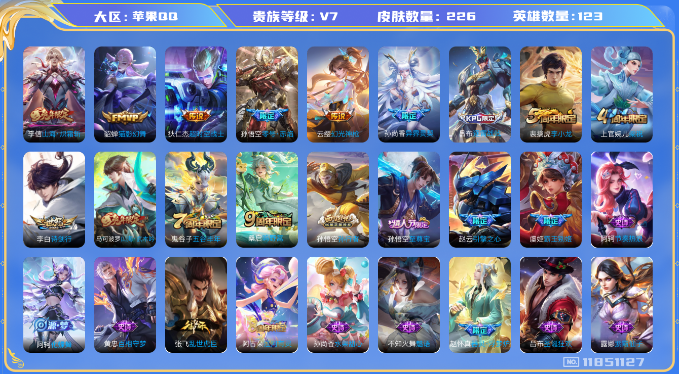 [11851127]V7 8传说 123英雄 226皮肤 可修改实名 优质装备:猫影幻舞,零号·赤焰,超时空战士-狄仁杰,山海·炽霜斩(李信年限) 传说皮:幻光神枪 珍宝阁皮:女武神,玩趣恶龙 限定皮:逐霄战戟,鸣野蒿,至尊宝,异界灵契(白毛香),诗剑行,五谷丰年,梁祝,李小龙,霸王别姬-虞姬,孙行者,引擎之心,山海·玄木吟(马可年限) 史诗皮:器灵·浮梦炉,绮世丹青,化蝶舞,百相守梦-黄忠,紫霞仙子,江河有灵,魅语,百解令(蒙犽),蒙恬荣光圣徽,冰冠公主,乱世虎臣,节奏热浪,女仆咖啡,摇滚巨星,水果甜心,绅士熊喵,星夜王子,心灵骇客,鬼剑武藏,心灵战警,纤云弄巧,繁星吟游(呼啦呼啦),拒霜思,逐浪之夏,水晶猎龙者,金属风暴,圣诞狂欢,圣诞恋歌,鹰眼统帅,魅力维加斯,无心,未来纪元-赵云