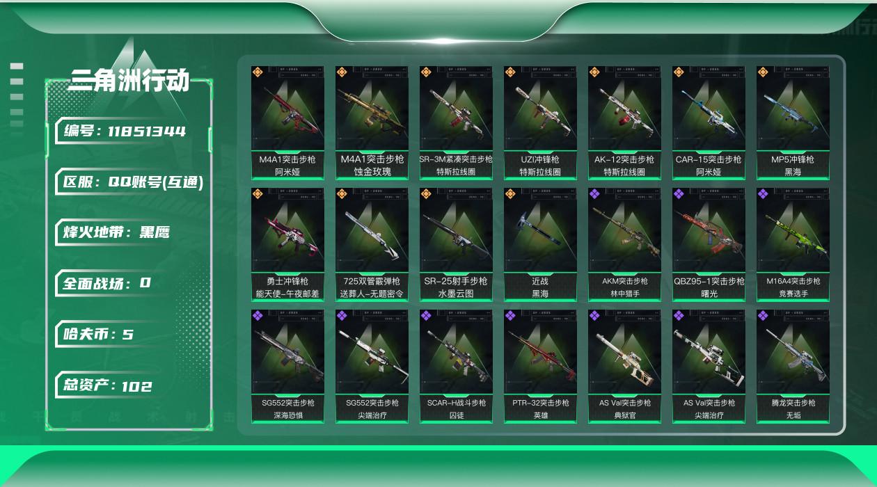 [11851344]总资产:102.7M 1干员外观 1近战传说 11传说枪械 哈夫币:5.644K 高级安全箱(2×3)9.15号到期 可二次 可修改实名 优质装备:近战-黑海 烽火地带段位:黑鹰 全面战场段位:列兵 传说武器皮肤:SR-25射手步枪-水墨云图,UZI冲锋枪-特斯拉线圈,AK-12突击步枪-特斯拉线圈,SR-3M紧凑突击步枪-特斯拉线圈,勇士冲锋枪-能天使-午夜邮差,725双管霰弹枪-送葬人-无题密令,M4A1突击步枪-阿米娅,CAR-15突击步枪-阿米娅,M4A1突击步枪-蚀金玫瑰,MP5冲锋枪-黑海 史诗武器皮肤:SG552突击步枪-尖端治疗,PKM通用机枪-守夜人,AS Val突击步枪-尖端治疗,SR-25射手步枪-尖端治疗,MP5冲锋枪-深海恐惧,勇士冲锋枪-深海恐惧,SG552突击步枪-深海恐惧,AKM突击步枪-林中猎手,M16A4突击步枪-竞赛选手,M250通用机枪-囚徒,PTR-32突击步枪-英雄,AS Val突击步枪-典狱官,SCAR-H战斗步枪-囚徒,腾龙突击步枪-无垢,MP7冲锋枪-无垢,PSG-1射手步枪-无垢,SVD狙击步枪-荒野求生,SR-3M紧凑突击步枪-荒野求生,PKM通用机枪-荒野求生,QBZ95-1突击步枪-曙光,M14射手步枪-黑鹰坠落,P90冲锋枪-紧急戒备 干员外观:红狼-蚀金玫瑰