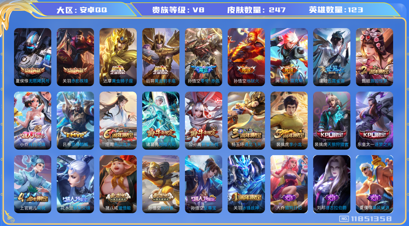 - [11884348]V8 1典藏 8传说 126英雄 297皮肤 典藏英雄武则天 可修改实名 信用分57分 优质装备:弑枪猎影(韩信典藏),一念神魔,云霓雀翎,末日机甲-孙尚香(绿蚂蚱),零号·赤焰,超时空战士-狄仁杰 珍宝阁皮:女武神,玩趣恶龙 限定皮:至尊宝,白晶晶,时雨天司(水龙头),神威(电光马子),遇见飞天,高山流水,五谷丰年,冰锋战神,游园惊梦,梁祝,天狼溯光者,奔雷神使(牛魔年限),祈雪灵祝(雪兔子),李小龙,霸王别姬-项羽,霸王别姬-虞姬,孙行者,猪悟能,一生所爱,大圣娶亲,冰霜恋舞曲 史诗皮:百相守梦-黄忠,白龙吟,黄金分割率,特工魅影,千年之狐,江河有灵,魅语,冰冠公主,偶像歌手,龙骑士(小龙虾),末日机甲-吕布,猫狗日记-孙策,时之恋人-孙尚香,乱世虎臣,节奏热浪,修罗,女仆咖啡,摇滚巨星,水果甜心,天才门将,星夜王子,时之奇旅-安琪拉,功夫厨神,德古拉伯爵,暗隐猎兽者,幽灵船长,暗渊魔法,心灵战警,舞动绿茵,地狱岩魂,纤云弄巧,拒霜思,缤纷独角兽,乘风破浪,逐浪之夏,水晶猎龙者,曙光守护者,热力回旋,箭羽风息,金属风暴,原初追逐者,圣诞狂欢,圣诞恋歌,鹰眼统帅,暗夜贵公子,魅力维加斯,黎明之约