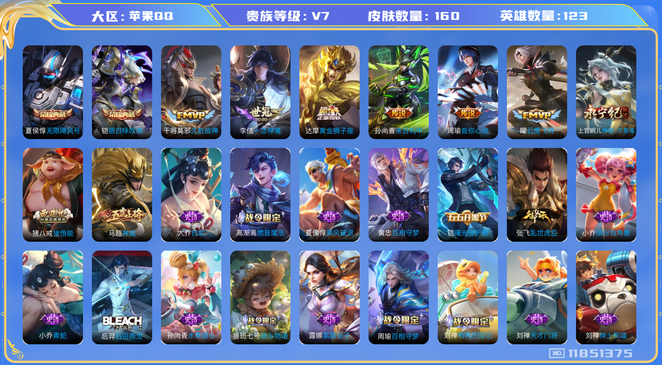 [11851375]V7 2典藏 6传说 123英雄 160皮肤 可修改实名 优质装备:无限飓风号(高达),银白咏叹调(倪克斯侍卫),黄金狮子座,云鹰飞将(小将军),久胜战神,一念神魔,末日机甲-孙尚香(绿蚂蚱),音你心动-周瑜 限定皮:神威(电光马子),猪悟能,神器·万象笔 史诗皮:鸭鸭历险记-刘禅,石田雨龙,百相守梦-周瑜,蔬乡物语(鲁班七号),百相守梦-黄忠,织梦人,紫霞仙子,特工魅影,千年之狐,高渐离燃音魔法,无限星赏官,冰冠公主,青蛇,偶像歌手,白蛇,龙骑士(小龙虾),乱世虎臣,修罗,摇滚巨星,水果甜心,绅士熊喵,天才门将,暗隐猎兽者,鬼剑武藏,心灵战警,舞动绿茵,纤云弄巧,缤纷独角兽,乘风破浪,逐浪之夏,曙光守护者,魅力维加斯,未来纪元-赵云
