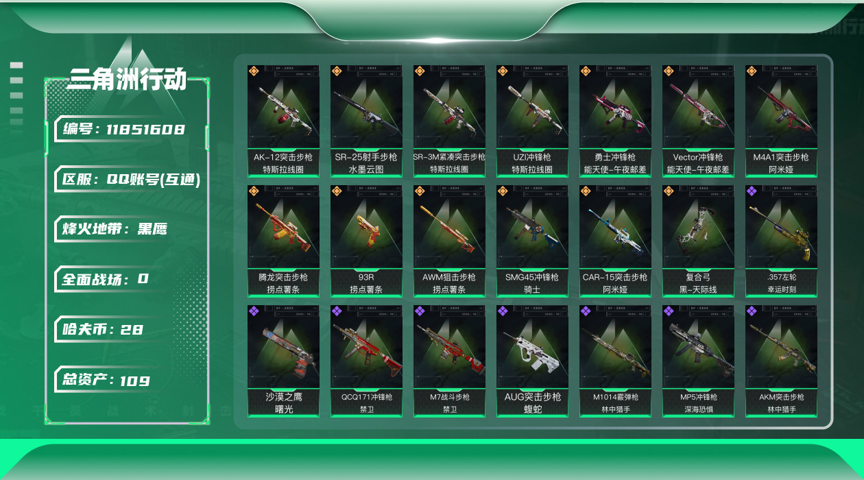 [11851608]总资产:109.2M 13传说枪械 哈夫币:28.933K 进阶安全箱(9.17到期) 可二次 可修改实名 烽火地带段位:黑鹰 全面战场段位:上等兵 传说武器皮肤:SR-25射手步枪-水墨云图,SMG45冲锋枪-骑士,UZI冲锋枪-特斯拉线圈,AWM狙击步枪-捞点薯条,腾龙突击步枪-捞点薯条,93R-捞点薯条,AK-12突击步枪-特斯拉线圈,SR-3M紧凑突击步枪-特斯拉线圈,勇士冲锋枪-能天使-午夜邮差,Vector冲锋枪-能天使-午夜邮差,复合弓-黑-天际线,M4A1突击步枪-阿米娅,CAR-15突击步枪-阿米娅 史诗武器皮肤:SR-3M紧凑突击步枪-英雄,AUG突击步枪-蝮蛇,G3战斗步枪-战场英杰,Ash-12战斗步枪-守夜人,M16A4突击步枪-竞赛选手,AS Val突击步枪-尖端治疗,M700狙击步枪-守夜人,SG552突击步枪-尖端治疗,M1014霰弹枪-林中猎手,MP5冲锋枪-深海恐惧,SG552突击步枪-深海恐惧,AKM突击步枪-林中猎手,.357左轮-幸运时刻,SVD狙击步枪-暗夜猎手,QCQ171冲锋枪-禁卫,SV-98狙击步枪-林中猎手,M250通用机枪-囚徒,SV-98狙击步枪-囚徒,QBZ95-1突击步枪-曙光,沙漠之鹰-曙光,Vector冲锋枪-阿萨拉文明,SVD狙击步枪-阿萨拉工艺,M7战斗步枪-禁卫,PKM通用机枪-英雄,QSZ92G-风林火山
