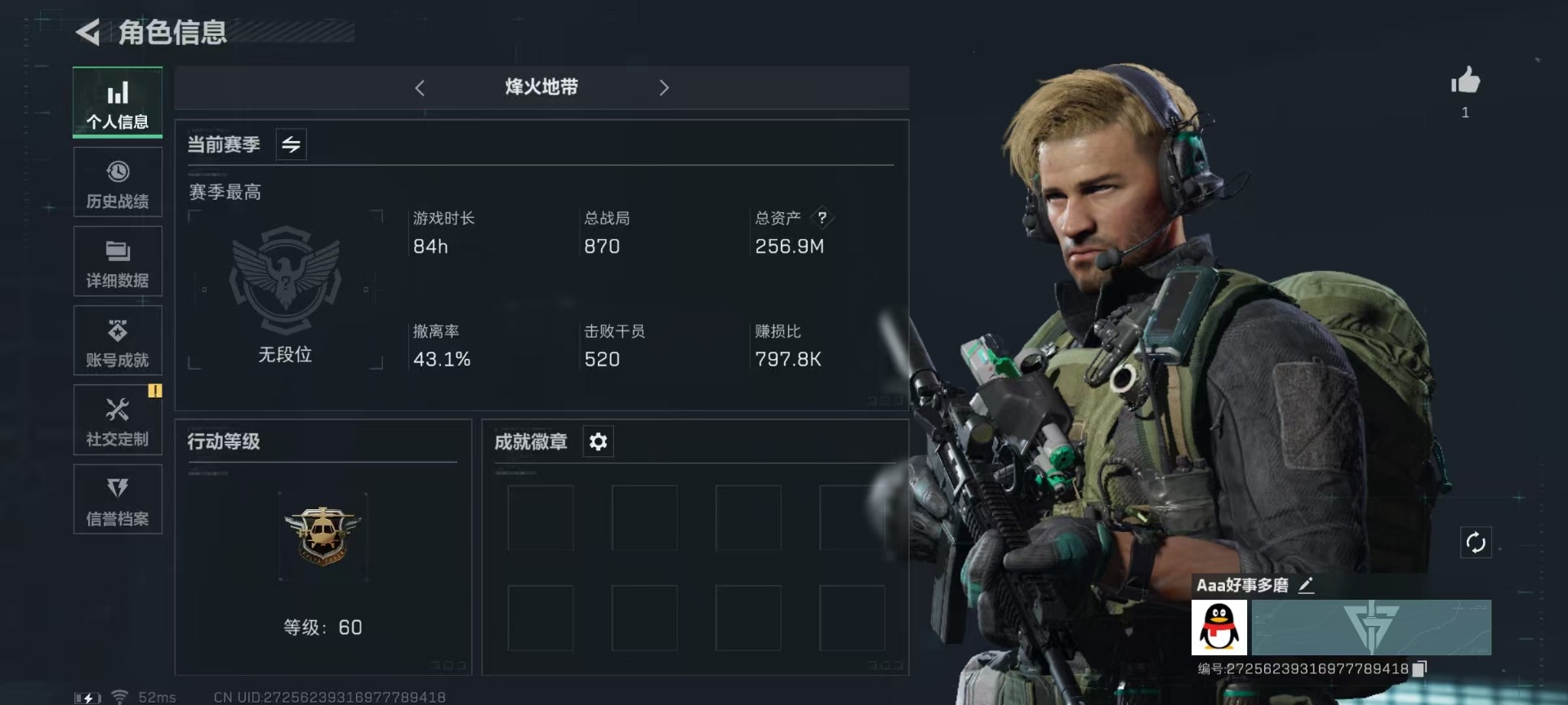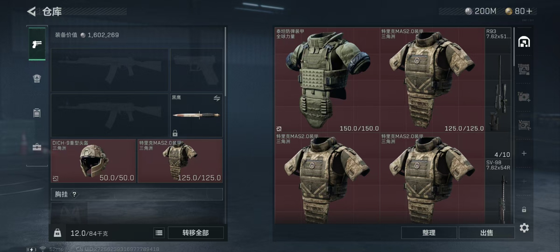 [11851639]总资产:256.9M 8传说枪械 哈夫币:200K 进阶安全箱(2×2)9.15号到期 可二次 可修改实名 烽火地带段位:无段位 全面战场段位:无段位 传说武器皮肤:UZI冲锋枪-特斯拉线圈,AWM狙击步枪-捞点薯条,腾龙突击步枪-捞点薯条,93R-捞点薯条,AK-12突击步枪-特斯拉线圈,SR-3M紧凑突击步枪-特斯拉线圈,勇士冲锋枪-能天使-午夜邮差,M4A1突击步枪-阿米娅 史诗武器皮肤:QJB201轻机枪-Old Habits,SG552突击步枪-深海恐惧,SV-98狙击步枪-林中猎手