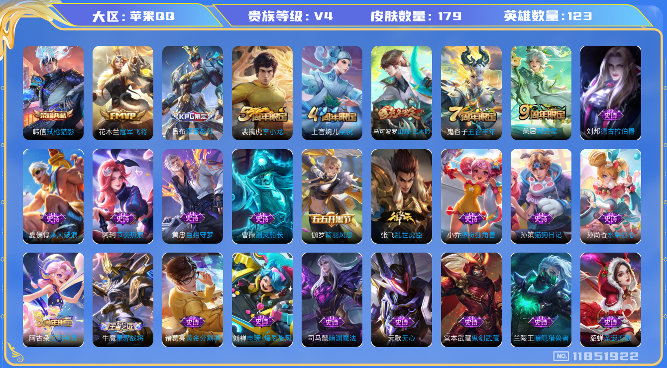 [11851922]V4 1典藏 2传说 123英雄 179皮肤 可修改实名 优质装备:弑枪猎影(韩信典藏),冠军飞将 珍宝阁皮:胡桃夹子,女武神 限定皮:逐霄战戟,鸣野蒿,五谷丰年,梁祝,李小龙,山海·玄木吟(马可年限) 史诗皮:星界战将,蒙犽顽岩魄,百相守梦-黄忠,黄金分割率,江河有灵,百解令(蒙犽),蒙恬荣光圣徽,电玩·爆裂旋风,猫狗日记-孙策,乱世虎臣,节奏热浪,水果甜心,星夜王子,功夫厨神,德古拉伯爵,暗隐猎兽者,幽灵船长,鬼剑武藏,暗渊魔法,舞动绿茵,缤纷独角兽,乘风破浪,逐浪之夏,水晶猎龙者,箭羽风息,金属风暴,原初追逐者,圣诞恋歌,鹰眼统帅,魅力维加斯,黎明之约,无心,未来纪元-赵云