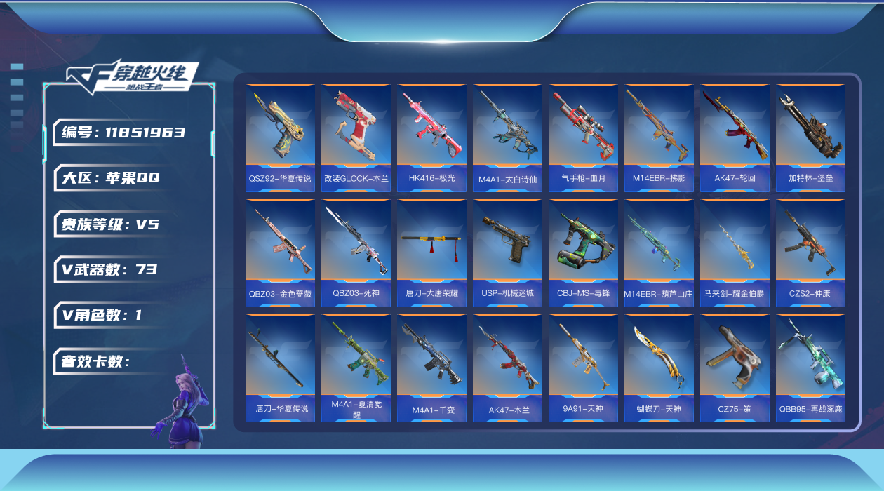 [11851963]可二次 可修改实名 V5 2王者武器 73英雄武器 1英雄角色 112万化 枪王 武器:王者之翎,TAC-慈,81式-光明之神,CZ75-策,王者之锋,M4A1-游骑兵,AK47-木兰,M4A1-死神,AK47-火麒麟,M4A1-雷神,AK47-燎天净火,QBZ03-金色蔷薇,QBZ03-死神,KSG-黑骑士,AK47-猩红传说,AK47-华夏传说,AK47-血武士,M4A1-海骑士,M4A1-心动次元,M4A1-夏清觉醒,M4A1-运输船,M4A1-千变,9A91-天神,CBJ-MS-毒蜂,AA12-火药,地狱烈炎,加特林-堡垒,AK47-轮回,MK47-鼓龙,M14EBR-拂影,HK416-极光,M4A1-太白诗仙,沙鹰-修罗,沙鹰-幻兽,USP-机械迷城,气手枪-血月,QSZ92-华夏传说,沙鹰-宇航兔兔,改装GLOCK-木兰,QBB95-再战涿鹿,尼泊尔-机械纪元,马来剑-毁灭,屠龙,唐刀-大唐荣耀,唐刀-华夏传说,蝴蝶刀-天神,高爆手雷-雷暴,燃烧弹-游骑兵,烟雾弹-游骑兵,闪光弹-游骑兵,死神手雷,死神闪光弹,死神烟雾弹,手雷-云海游龙,CZS2-仲康,M14EBR-葫芦山庄,HK417-朱雀,马来剑-耀金伯爵,炽芒蝶刀