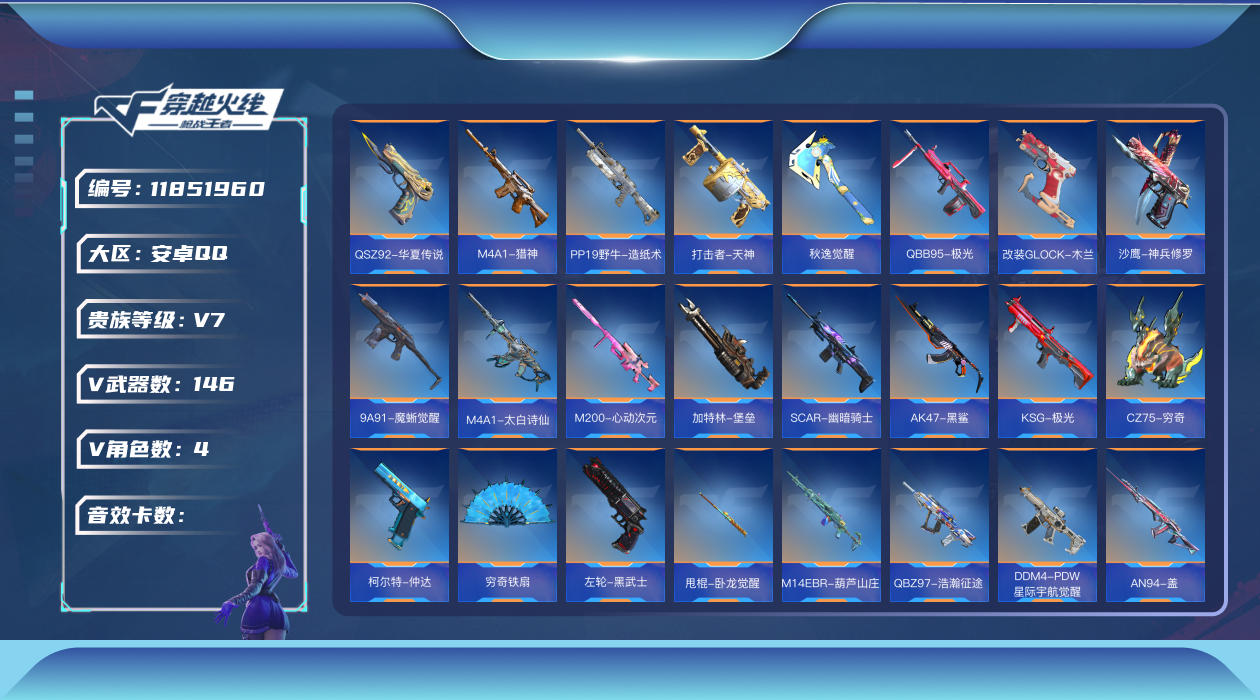 - [11253191]V7 1典藏 6传说 124英雄 276皮肤 可修改实名 女号 优质装备:弑枪猎影(韩信典藏),黄金射手座,冠军飞将,无双飞将 传说皮:幻光神枪 珍宝阁皮:胡桃夹子,蔷薇恋人,女武神 限定皮:逐霄战戟,鸣野蒿,傲雪梅枪,神威(电光马子),遇见飞天,高山流水,齐天大圣,五谷丰年 史诗皮:化蝶舞,星界特工,星界战将,龙之律动,雪豹·霜爪,石田雨龙,茶境仙,破空之剑,蒙犽顽岩魄,怒海争锋,紫霞仙子,苍穹之光,白龙吟,黄金分割率,特工魅影,千年之狐,百相守梦(关羽),电玩·爆裂旋风,江河有灵,百解令(蒙犽),蒙恬荣光圣徽,偶像歌手,魅语,冰冠公主,末日机甲-吕布,猫狗日记-孙策,猫狗日记-大乔,乱世虎臣,节奏热浪,女仆咖啡,摇滚巨星,水果甜心,星夜王子,心灵骇客,功夫厨神,幽灵船长,鬼剑武藏,心灵战警,舞动绿茵,地狱岩魂,纤云弄巧,缤纷独角兽,乘风破浪,逐浪之夏,月团寄思,水晶猎龙者,金属风暴,原初追逐者,圣诞狂欢,圣诞恋歌,鹰眼统帅,暗夜贵公子,魅力维加斯,黎明之约,赏金猎手,无心,未来纪元-赵云