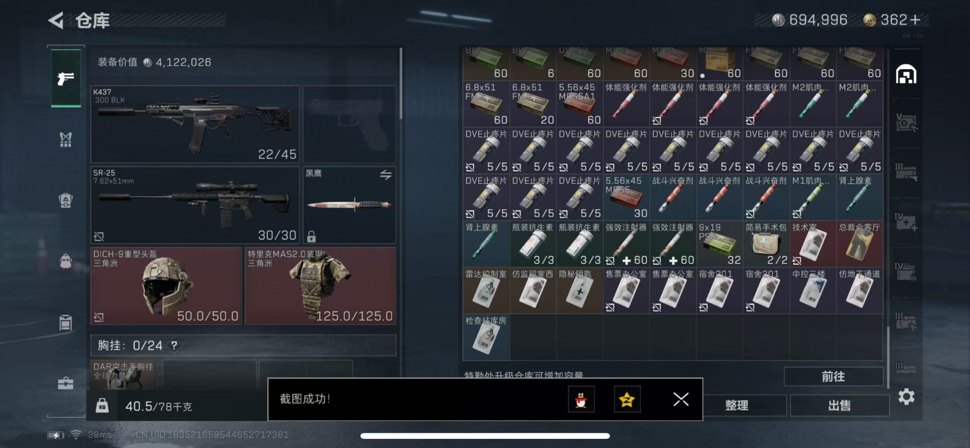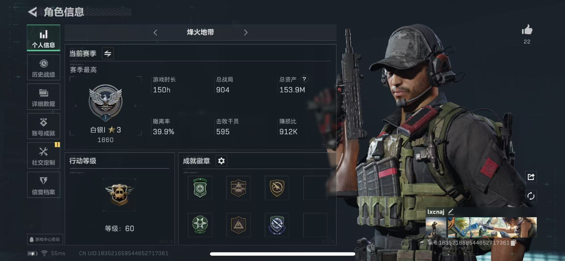 - [11251590]总资产:201.4 2干员外观 1近战传说 2传说枪械 可二次 可修改实名 优质装备:近战-北极星 烽火地带段位:黑鹰 全面战场段位:上等兵 哈夫币:17.708 传说武器皮肤:M4A1突击步枪-蚀金玫瑰 史诗武器皮肤:M4A1突击步枪-特勤执行 干员外观:红狼-蚀金玫瑰,露娜-黑·天际线