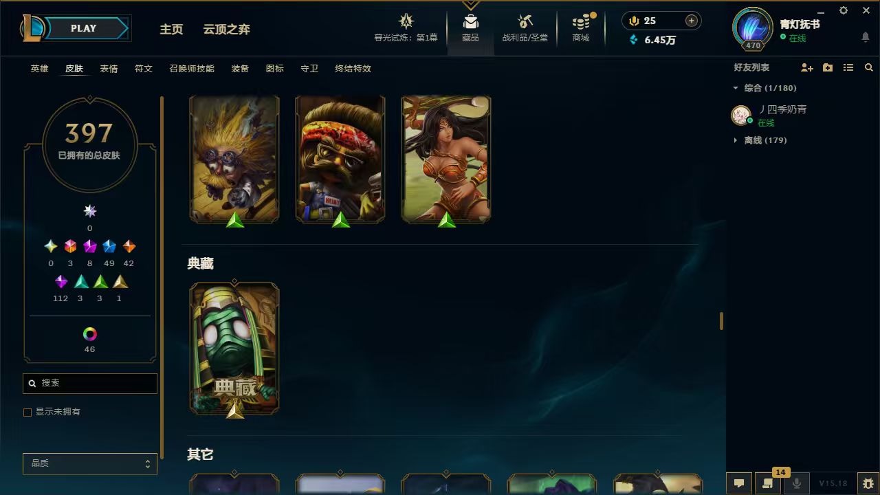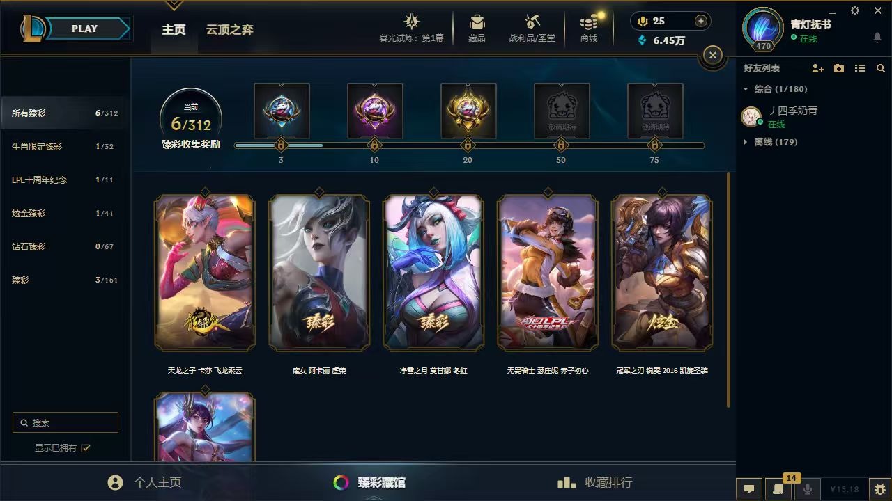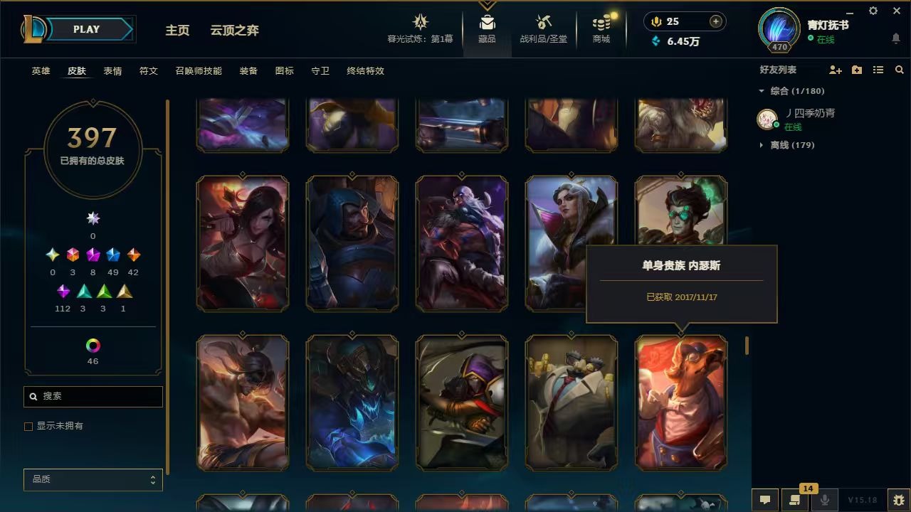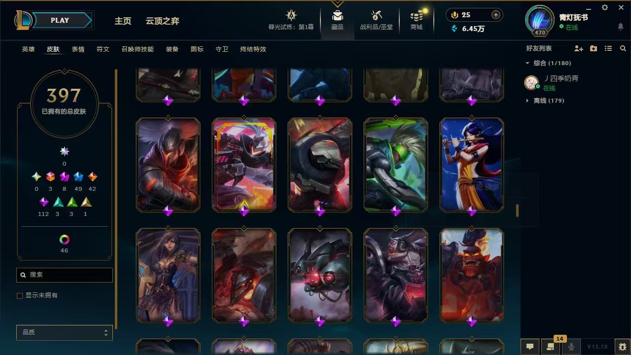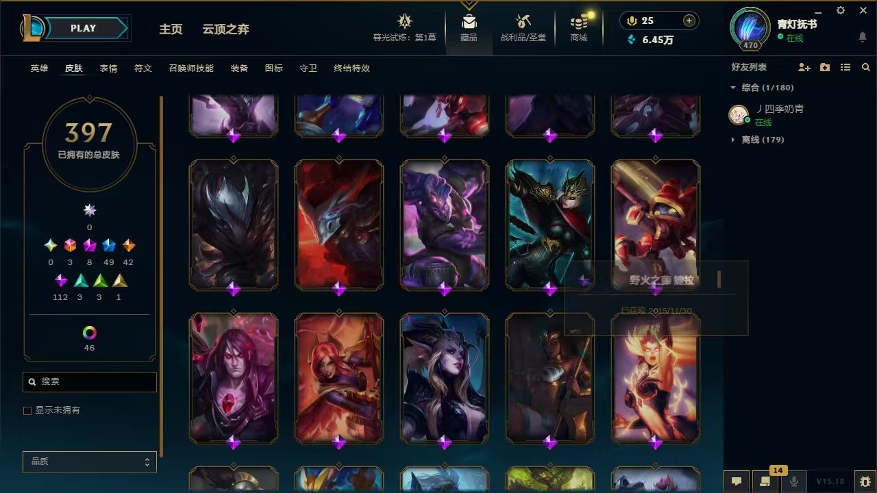 [11852053]3终极 8神话 49限定 42传说 112史诗 397皮肤 71炫彩 170英雄 可二次 可修改实名 优质装备:至臻 绒毛菲兹,至臻 征服者 贾克斯,源代码 乐芙兰,防爆天使 凯尔,都铎王朝 图奇,夺命美人 卡特,防爆士兵 格雷福斯,冠军典狱长 锤石,冠军之刃 锐雯,冠军之刃 锐雯 2016,红桃杰克 崔斯特,蒙多蒙多,密林猎手 提莫,大元素使,未来战士,DJ-娑娜,奥德赛 吉格斯,玉剑传说 舞剑仙 承影,冠军之刃 锐雯 2016 凯旋圣装,无畏骑士 瑟庄妮 赤子初心,外星装甲 库奇,至臻 绒毛 菲兹,净雪之月 莫甘娜 冬虹,十五周年纪念 希维尔,魔女 阿卡丽 虚荣,暗裔英雄 盖伦 海克斯:海克斯 魔腾 赛季限定皮:胜利女神 希维尔,胜利枪神 格雷福斯,胜利女神 奥利安娜 冠军限定系列:S1FNC 迦娜,S1FNC 嘉文四世,S1FNC 卡尔萨斯,S2 暗杀星 蒙多,S2 暗杀星 努努,S2 暗杀星 慎,S3 SKT T1 婕拉,S4 SSW 雷恩加尔,S4 SSW 泰隆 冰雪节限定:胡桃夹子 小丑,魄罗骑士 瑟庄妮,圣诞开心鬼 提莫,圣诞狂欢 努努,圣诞老人 酒桶,圣诞玩偶 波比,圣诞驯鹿 克格莫,邪恶圣诞老人 维迦,幸福女神 乐芙兰,雪球也能爆炸 吉格斯,雪默丁格 泳池派对:泳池派对 吉格斯,泳池派对 蕾欧娜,泳池派对 李青,泳池派对 球女 万圣节限定:魅惑女巫 厄运小姐,无头骑士 人马 年限:点心宝贝 阿木木,天龙之子 斯莫德,龙年 孙悟空,蛇年 安妮,蛇年 库奇,马年 锐雯,羊年 金克丝 周年:4周年 锐雯,10周年 安妮,10周年 凤凰