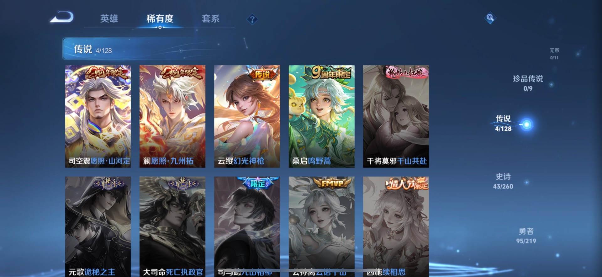 - [11285108]V7 2典藏 1无双 11传说 124英雄 233皮肤 可修改实名 荣耀水晶:神鉴启示录,全息碎影(猴子典藏) 无双皮:小乔时之魔女(小乔无双) 传说皮:乘龙·问璇玑(孙尚香年限),幻光神枪,遇见胡旋,一念神魔,云鹰飞将(小将军),炽阳神光,飞鸢探春 珍宝阁皮:蔷薇恋人,女武神 限定皮:愿照·千秋盛(女娲年限),映山客,鸣野蒿,傲雪梅枪,绯月行,高山流水,五谷丰年,游园惊梦,青春决赛季,冰霜恋舞曲,匿光追影者 史诗皮:星界战将,龙之律动,石田雨龙,百相守梦-黄忠,芈月浮光幕影,琥珀纪元伽罗,化蝶舞,特工魅影,千年之狐,永昼,高渐离燃音魔法,百解令(蒙犽),蒙恬荣光圣徽,冰冠公主,偶像歌手,无限星赏官,魅语,末日机甲-吕布,猫狗日记-孙策,乱世虎臣,节奏热浪,女仆咖啡,摇滚巨星,水果甜心,天才门将,星夜王子,心灵骇客,功夫厨神,德古拉伯爵,暗隐猎兽者,幽灵船长,鬼剑武藏,舞动绿茵,拒霜思,缤纷独角兽,逐浪之夏,水晶猎龙者,箭羽风息,金属风暴,原初追逐者,圣诞恋歌,鹰眼统帅,暗夜贵公子,魅力维加斯,黎明之约,未来纪元-赵云