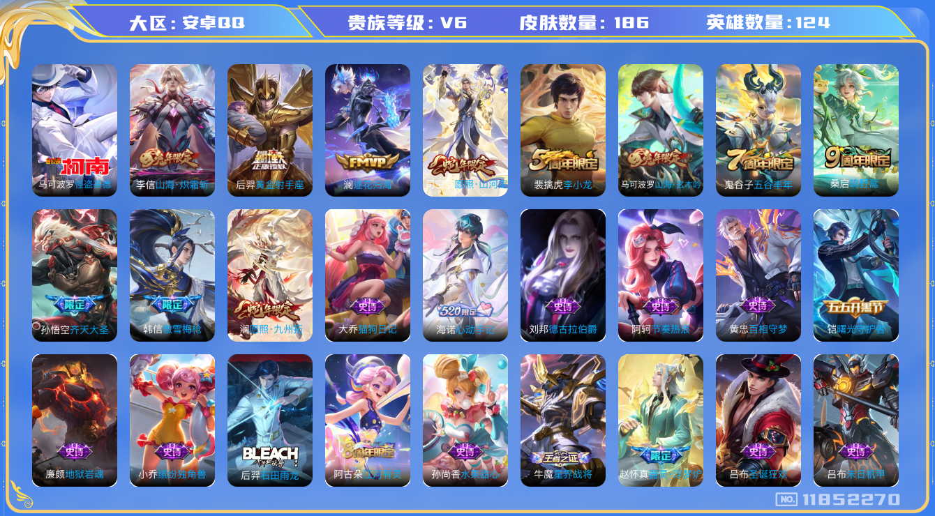 [11852270]V6 1珍品传说 7传说 124英雄 186皮肤 可修改实名 优质装备:怪盗基德,黄金射手座,山海·炽霜斩(李信年限),澜逐花归海,涂山容容 珍宝阁皮:胡桃夹子,蔷薇恋人 限定皮:愿照·九州拓(澜年限),愿照·山河定(司空震年限),鸣野蒿,傲雪梅枪,齐天大圣,五谷丰年,李小龙,山海·玄木吟(马可年限) 史诗皮:器灵·浮梦炉,星界战将,石田雨龙,蒙犽顽岩魄,海诺心动手记,百相守梦-黄忠,黄金分割率,千年之狐,江河有灵,百解令(蒙犽),晚萤,电玩·爆裂旋风,末日机甲-吕布,猫狗日记-大乔,节奏热浪,修罗,摇滚巨星,水果甜心,绅士熊喵,星夜王子,心灵骇客,功夫厨神,德古拉伯爵,暗隐猎兽者,鬼剑武藏,暗渊魔法,地狱岩魂,纤云弄巧,缤纷独角兽,水晶猎龙者,曙光守护者,金属风暴,原初追逐者,圣诞狂欢,圣诞恋歌,鹰眼统帅,魅力维加斯,无心,未来纪元-赵云