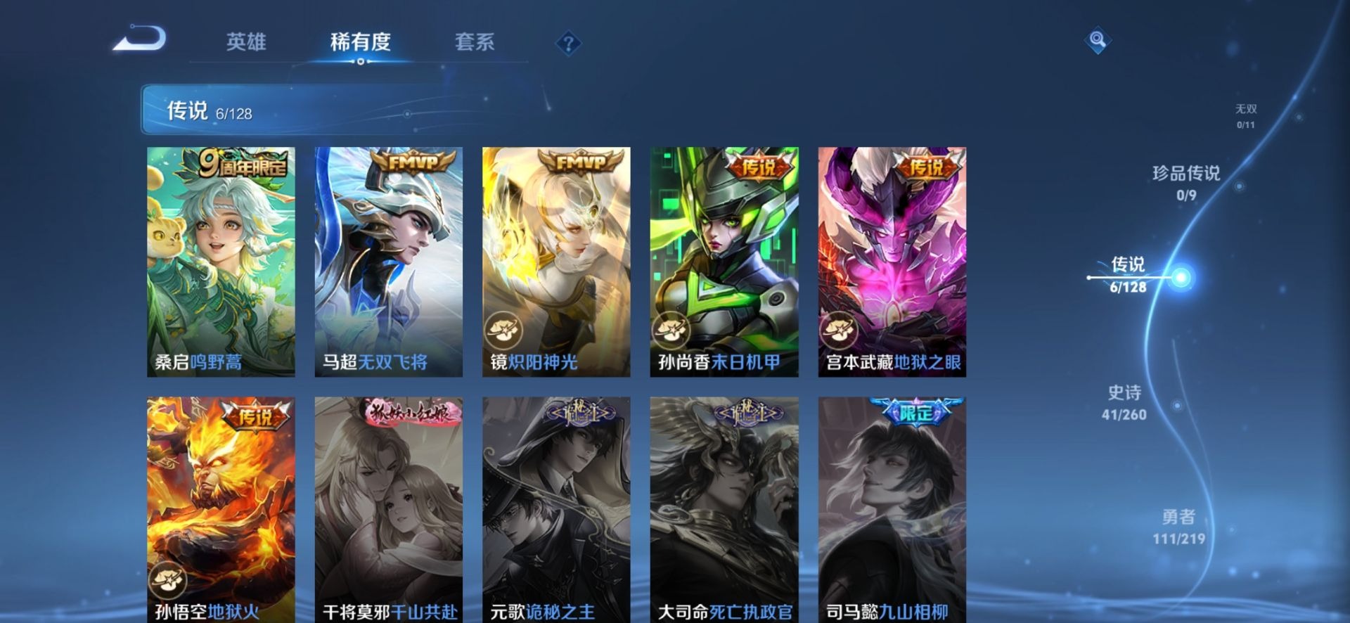 夏侯惇朔风刀,老夫子醍醐杖,盾山御銮,曹操烛龙,典韦穷奇,达摩沙漠行僧,牛魔御旌,裴擒虎擒涛扼浪,鲁班大师探海日志,明世隐疑决卦,白起狰,鬼谷子原初探秘者,张良古海寻踪,桑启海盐诗旅,狄仁杰万华元夜,芈月重明,程咬金演武夺筹,李元芳云中旅人,弈星混沌棋,米莱狄御霄,钟馗驱傩正仪,狂铁御狮,太乙真人饕餮