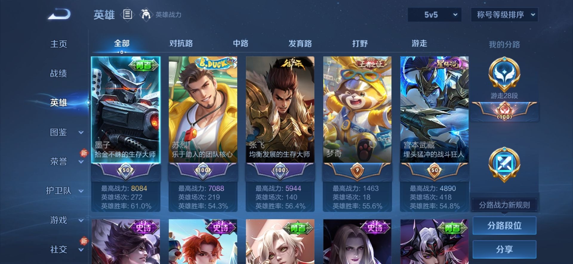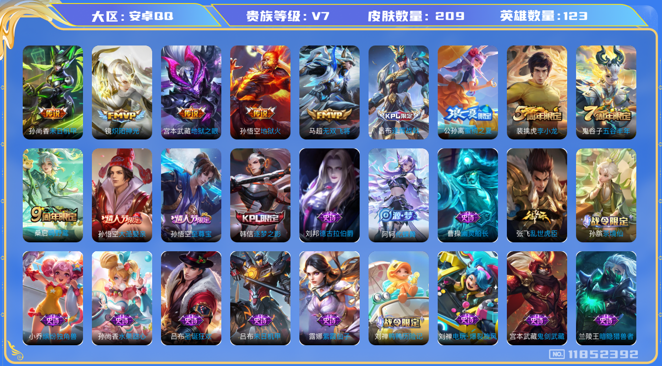 - PX_2096866-实名: 可修改 贵族等级: V7 英雄数: 122 皮肤数: 242 传说皮: 黄金射手座,挚爱之约,神器·狴犴令,山海·炽霜斩,燃星之曲,浮生妄,幻光神枪 限定皮: 李小龙,奔雷神使,梁祝,龙胆,寅虎·御盾,武陵仙君,高山流水,猪悟能,时之祈愿-云中君,时之祈愿-瑶,百木心枪,玉兔公主,匿光决锋者,深海之息,五谷丰年,鸣野蒿,逐霄战戟,愿照·山河定