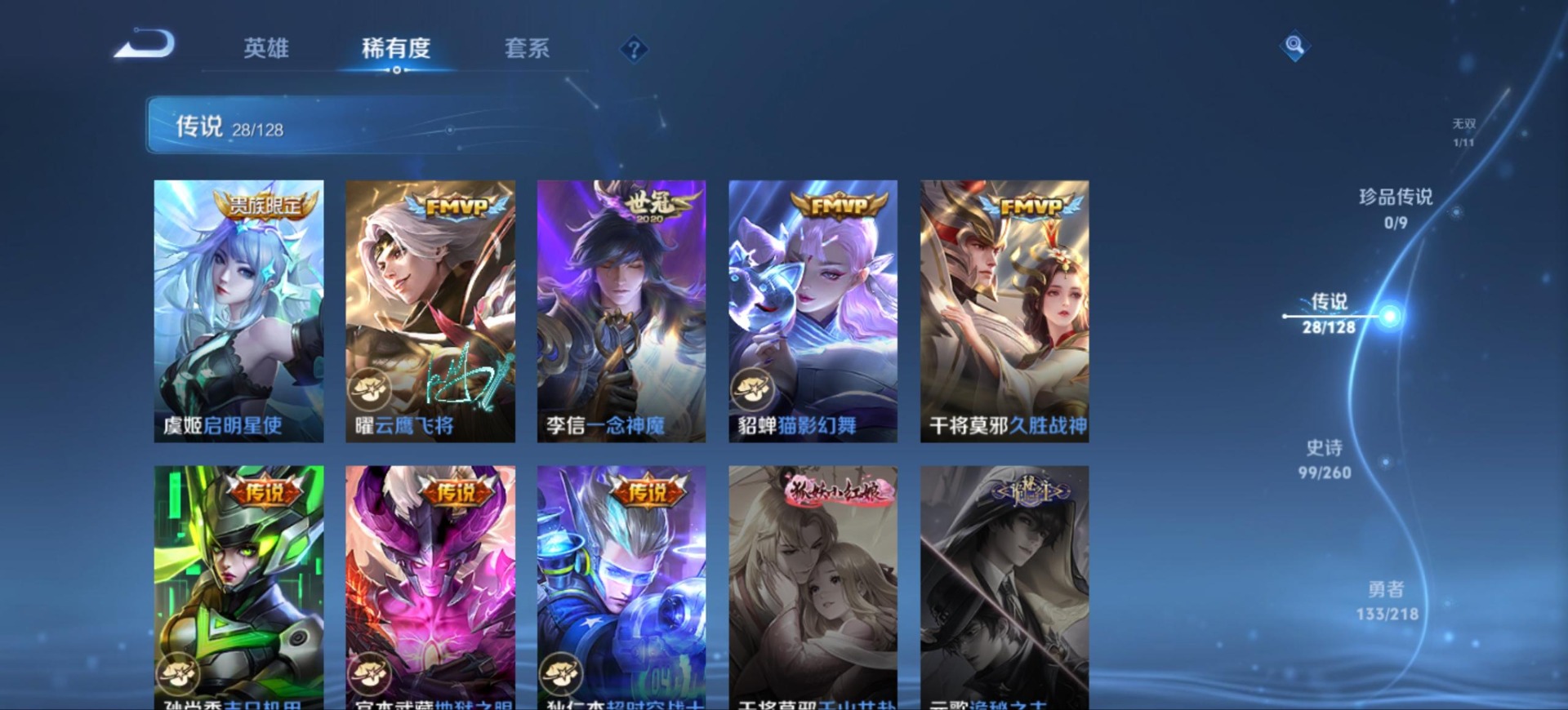 - PX_2057970-62 苹果QQ/至尊星耀/207皮肤/122英雄/1典藏/0珍品无双/0无双/3珍品传说/21传说/61史诗/6稀有英雄 【3 珍品传说】怪盗基德 马可波罗,时之奇旅 孙策,江户川柯南 鲁班七号, 【1 典藏皮肤】弑枪猎影 韩信, 【21 传说皮肤】武圣 关羽,启明星使 虞姬,逐花归海 澜,无双飞将 马超,云鹰飞将 曜,齐天大圣 孙悟空,诗剑行 李白,浮生妄 夏洛特,地狱之眼