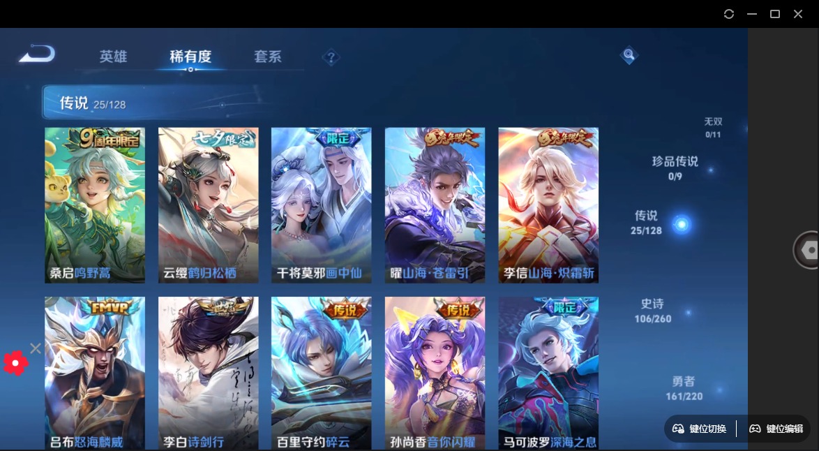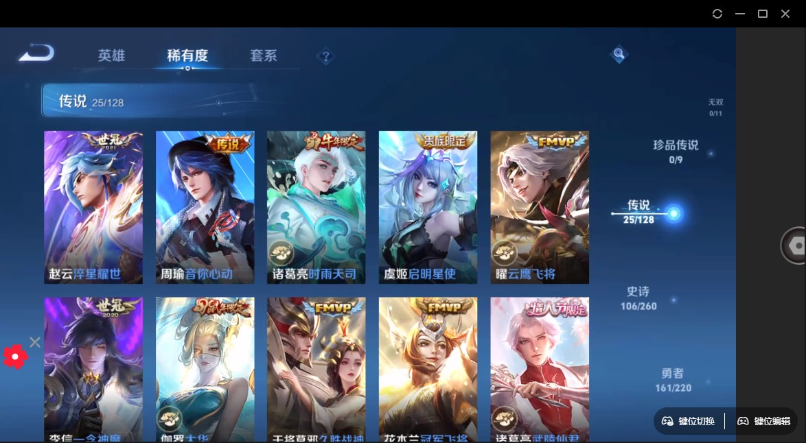 - [11884694]V8 1典藏 25传说 125英雄 250皮肤 可修改实名 优质装备:鸣剑·曳影,云鹰飞将(小将军),久胜战神,炽阳神光,一念神魔,云霓雀翎,末日机甲-孙尚香(绿蚂蚱),仲夏夜之梦(大飞蛾),游龙清影(小青龙),淬星耀世,碎云,神器·狴犴令,浮生妄,追逃游戏(亚瑟),澜逐花归海 传说皮:乘龙·问璇玑(孙尚香年限),乘龙·铭钟鼎(赵云年限),乘龙·淬吴钩(孙策年限),幻光神枪 珍宝阁皮:万物之道,女武神 限定皮:愿照·九州拓(澜年限),鸣野蒿,至尊宝,白虎志(电光耗子),时雨天司(水龙头),神威(电光马子),飞衡(韩信年限),遇见飞天,诗剑行,祈雪灵祝(雪兔子),李小龙,默契交锋-花木兰 史诗皮:化蝶舞,星界战将,龙之律动,乘龙·聚宝船(安琪拉年限),乘龙·忆丹青(大乔年限),紫霞仙子,黄金分割率,千年之狐,魅语,偶像歌手,晚萤,电玩·爆裂旋风,末日机甲-吕布,时之恋人-孙尚香,乱世虎臣,修罗,女仆咖啡,摇滚巨星,水果甜心,绅士熊喵,心灵骇客,功夫厨神,德古拉伯爵,暗隐猎兽者,幽灵船长,鬼剑武藏,心灵战警,地狱岩魂,纤云弄巧,逐浪之夏,水晶猎龙者,曙光守护者,原初追逐者,圣诞狂欢,圣诞恋歌,鹰眼统帅,魅力维加斯,未来纪元-赵云