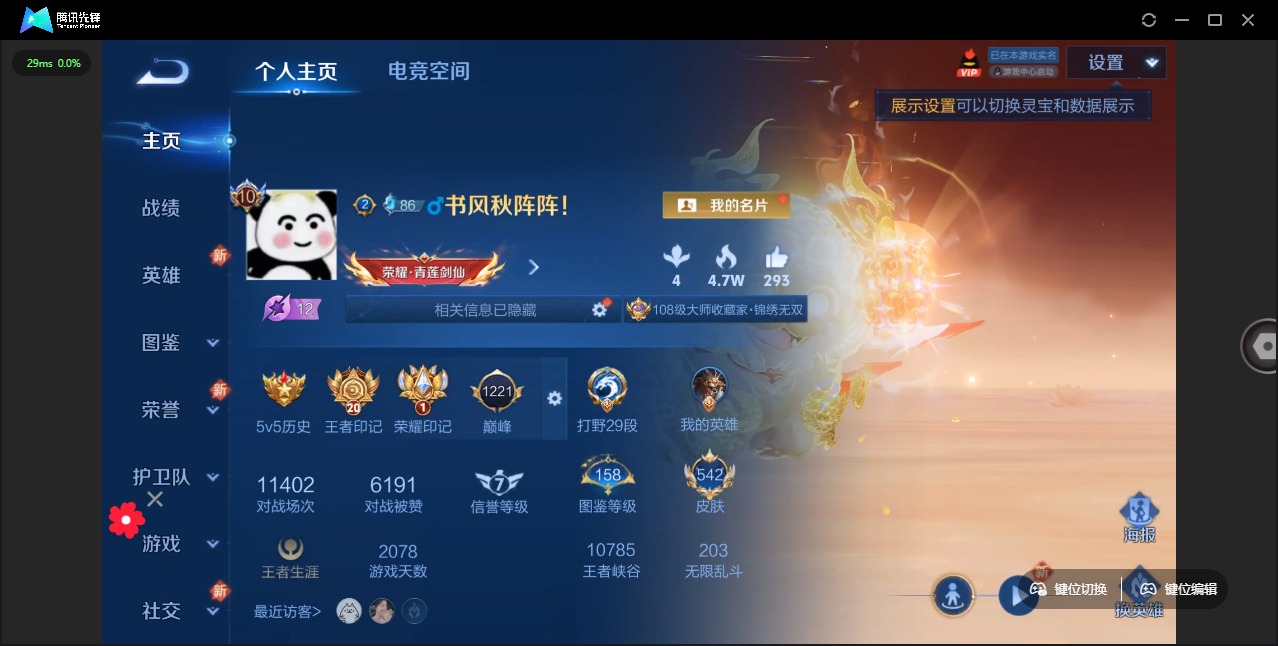 - [11229467]V8 2典藏 1珍品传说 12传说 125英雄 293皮肤 可修改实名 优质装备:鸣剑·曳影,九霄神辉(木兰典藏),怪盗基德,黄金射手座,猫影幻舞,末日机甲-孙尚香(绿蚂蚱),零号·赤焰,地狱之眼 珍宝阁皮:妄想食味,女武神 限定皮:愿照·九州拓(澜年限),愿照·千秋盛(女娲年限),鸣野蒿,至尊宝,凤求凰(白切鸡),白鹤梁神女,时雨天司(水龙头),神威(电光马子),遇见飞天,高山流水,五谷丰年,天狼运算者,梁祝,天狼溯光者,祈雪灵祝(雪兔子),李小龙,如梦令-后羿,霸王别姬-项羽,霸王别姬-虞姬,神奇女侠 史诗皮:星界战将,茶境仙,器灵·浮梦炉,鸭鸭历险记-刘禅,灵蛊蚀心,龙之律动,百相守梦-百里守约,百相守梦-黄忠,东方月初,蒙犽顽岩魄,埋骨钱,蔬乡物语(鲁班七号),琥珀纪元伽罗,百相守梦-周瑜,化蝶舞,破空之剑,紫霞仙子,电玩小子(小书包),黄金分割率,特工魅影,千年之狐,江河有灵,高渐离燃音魔法,冰冠公主,偶像歌手,晚萤,无限星赏官,白蛇,末日机甲-吕布,猫狗日记-孙策,乱世虎臣,节奏热浪,修罗,女仆咖啡,摇滚巨星,水果甜心,天才门将,星夜王子,心灵骇客,功夫厨神,德古拉伯爵,暗隐猎兽者,幽灵船长,鬼剑武藏,心灵战警,乐园奇幻夜,天秀·启明,舞动绿茵,地狱岩魂,纤云弄巧,繁星吟游(呼啦呼啦),拒霜思,缤纷独角兽,乘风破浪,逐浪之夏,月团寄思,水晶猎龙者,曙光守护者,箭羽风息,金属风暴,原初追逐者,圣诞狂欢,圣诞恋歌,鹰眼统帅,暗夜贵公子,黎明之约,未来纪元-赵云