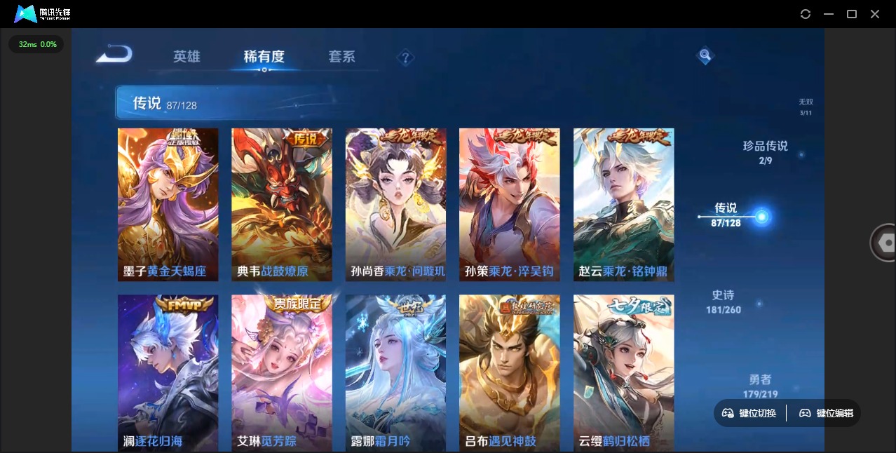 - PX_2101907-Q/至尊星耀/266皮肤/123英雄/1典藏/0珍品无双/0无双/2珍品传说/16传说/83史诗/7稀有英雄 【2 珍品传说】酷洛米之心 安琪拉,大耳狗之梦 瑶, 【1 典藏皮肤】鸣剑·曳影 李白, 【16 传说皮肤】启明星使 虞姬,逐花归海 澜,无双飞将 马超,云鹰飞将 曜,齐天大圣 孙悟空,惊梅引 宫本武藏,地狱之眼 宫本武藏,炽阳神光 镜,时之恋人 刘备,黄金狮子座 达