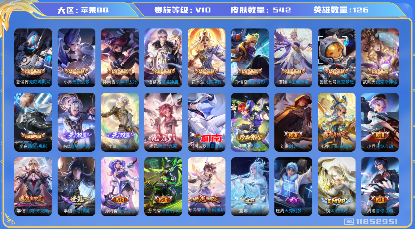 [11852951]V10 10典藏 3无双 2珍品传说 87传说 126英雄 542皮肤 典藏英雄武则天 可修改实名 优质装备:天鹅之梦(小乔典藏),星空梦想(太空人),倪克斯神谕(宇宙婆娘),无限飓风号(高达),杀手不太冷,鸣剑·曳影,全息碎影(猴子典藏),星域神启(倪克斯贼亮),九霄神辉(木兰典藏),青丘·九尾(妲己无双),碎月剑心(李白无双),神鉴启示录,韩信群星魔术团(韩信无双),怪盗基德,黄金狮子座,黄金射手座,冠军飞将,云鹰飞将(小将军),绛天战甲(鸡嘴战神),黄金白羊座,猫影幻舞,久胜战神,炽阳神光,一念神魔,云霓雀翎,末日机甲-孙尚香(绿蚂蚱),地狱火,仲夏夜之梦(大飞蛾),音你心动-小乔,零号·赤焰,海洋之心,地狱之眼,飞鸢探春,音你心动-周瑜,胖达荣荣,李逍遥,乞巧织情,时之恋人-刘备(电焊工),游龙清影(小青龙),淬星耀世,超时空战士-狄仁杰,末日机甲-孙策,花朝如约(花篮子),挚爱之约,挚爱花嫁,无双飞将,音你闪耀(rap皮),碎云,天秀幻梦,神器·狴犴令,山海·炽霜斩(李信年限),山海·琳琅生(小乔年限),山海·苍雷引(电光曜子),画中仙,浮生妄,记忆之芯(机甲兔),青丘·九尾,鹤羽星尊,灼幽烈阳,妄想实况,妄想奇谈,鹤归松栖(云缨),遇见神鼓,霜月吟,澜逐花归海,艾琳觅芳踪,黄金天蝎座,云中君群星魔术团,玄雷天君,涂山容容 珍品传说:时之奇旅-孙策 传说皮:乘龙·问璇玑(孙尚香年限),乘龙·铭钟鼎(赵云年限),乘龙·淬吴钩(孙策年限),典韦战鼓燎原,幻光神枪 珍宝阁皮:胡桃夹子,蔷薇恋人,玩趣恶龙 限定皮:愿照·九州拓(澜年限),愿照·福禄聚(蔡文姬年限),愿照·岁时盈(虞姬年限),愿照·山河定(司空震年限),愿照·众生和(妲己年限),愿照·千秋盛(女娲年限),逐霄战戟,鸣野蒿,至尊宝,白虎志(电光耗子),凤求凰(白切鸡),太华(伽罗年限),武陵仙君(小桃花),异界灵契(白毛香),傲雪梅枪,补天,寅虎·展翼(孙膑年限),前尘镜,星穹之声,绯月行,魔法小厨娘,时雨天司(水龙头),神威(电光马子),飞衡(韩信年限),山海·碧波行(瑶年限),瑞麟志(木兰年限),高山流水,诗剑行,匿光决锋者,怒海麟威,降魔,五谷丰年,青龙志(铠年限),幽恒(沐浴露),武圣,游园惊梦,梁祝,御风骁将(吕布年限),天狼狩猎者,烈魂,岱宗(典韦年限),天狼溯光者,奔雷神使(牛魔年限
