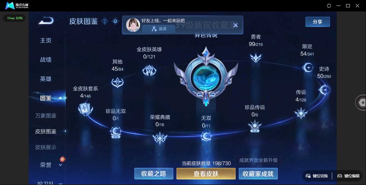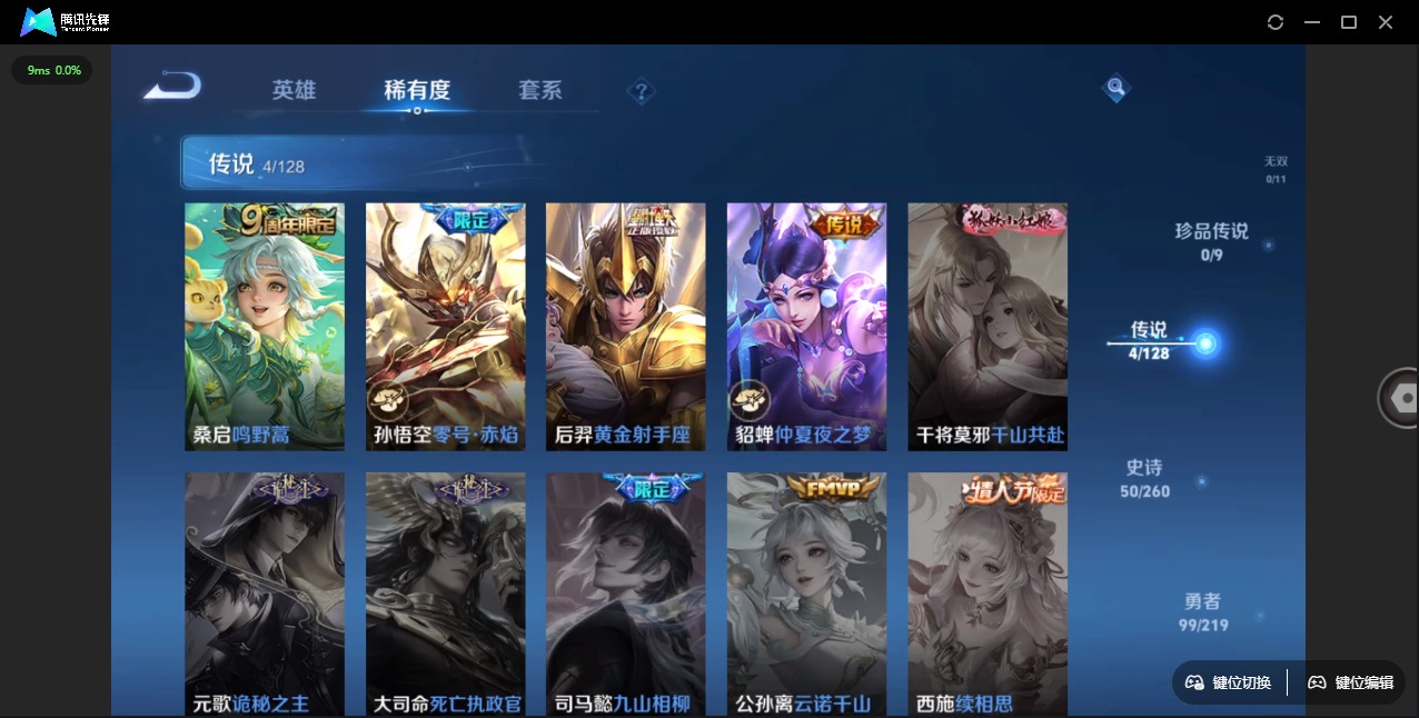 - PX_2095368-88 安卓QQ/尊贵铂金/53皮肤/75英雄/0典藏/0珍品无双/0无双/0珍品传说/5传说/8史诗/6稀有英雄 【5 传说皮肤】久胜战神 干将莫邪,愿照·九州拓 澜,幻光神枪 云缨,愿照·岁时盈 虞姬,鸣野蒿 桑启, 【8 史诗皮肤】魅力维加斯 妲己,鹰眼统帅 狄仁杰,特工魅影 百里守约,猫狗日记 孙策,皇家上将 赵云,圣诞狂欢 吕布,蔷薇恋人 孙尚香,心灵骇客 安琪拉,
